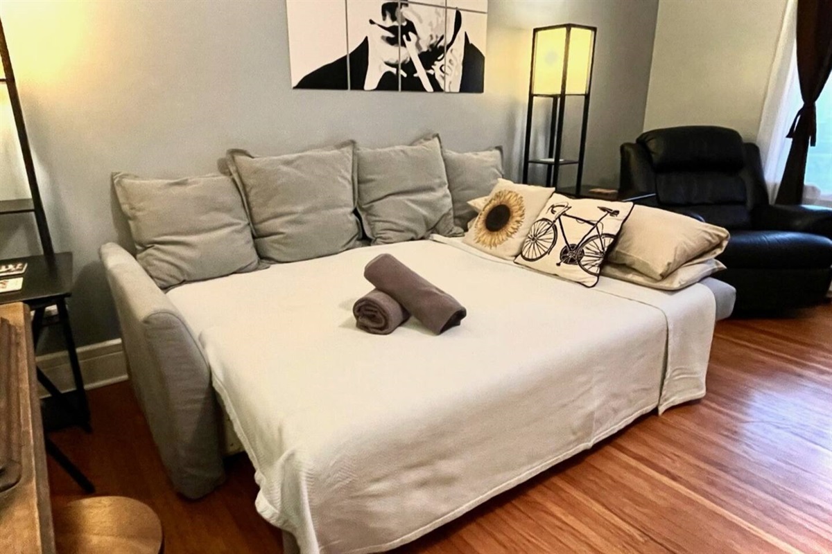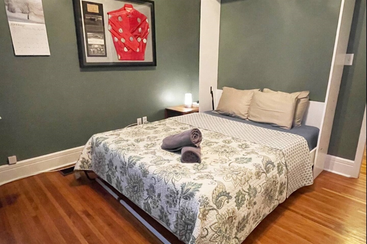 And in the second bedroom - a surprise queen Murphy bed that folds away to transform the space into a yoga retreat or bonus work space as needed.