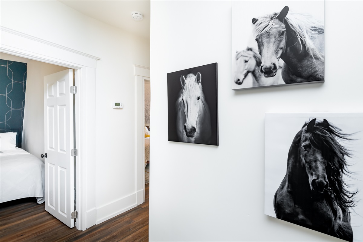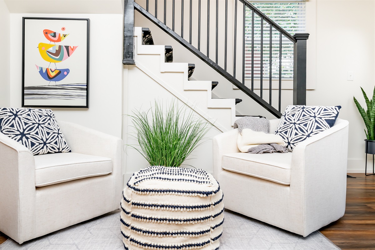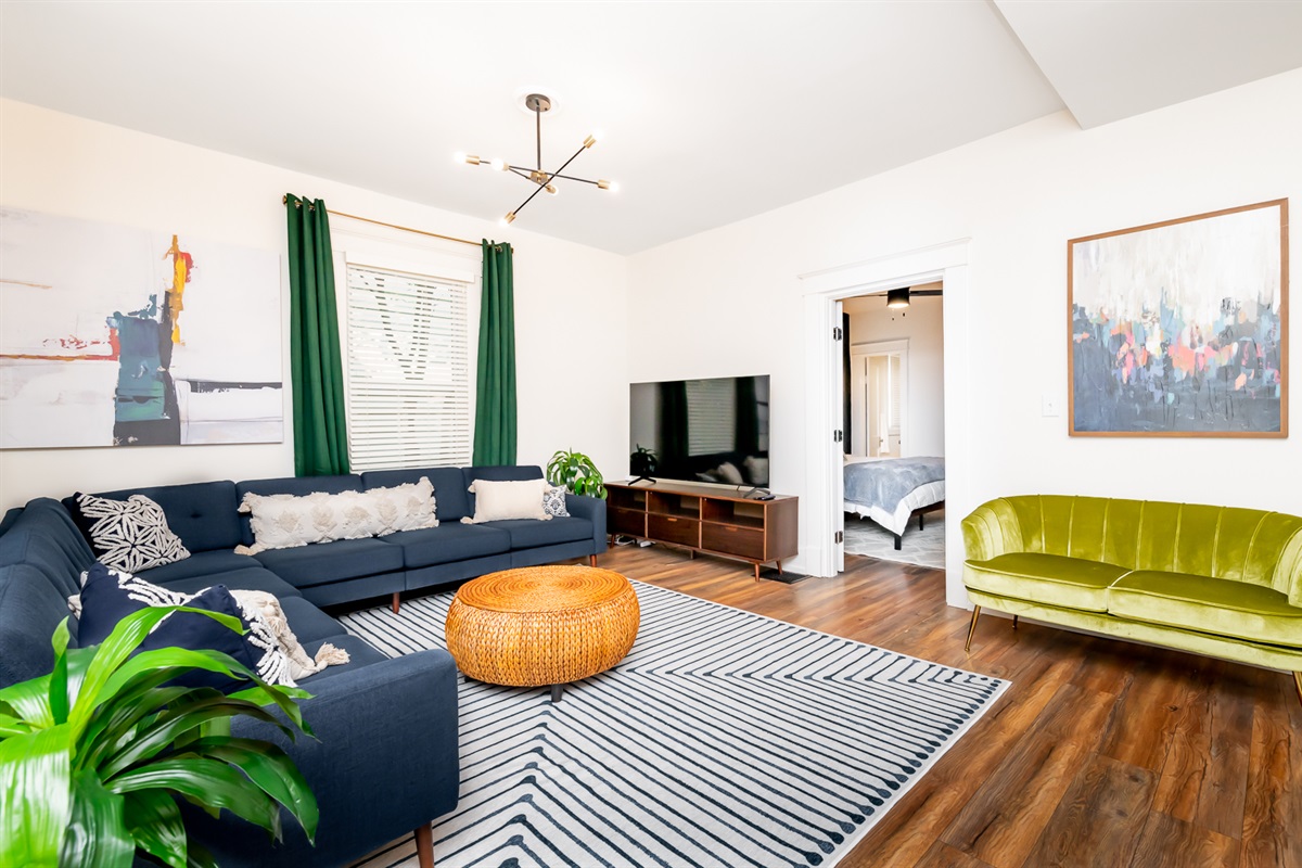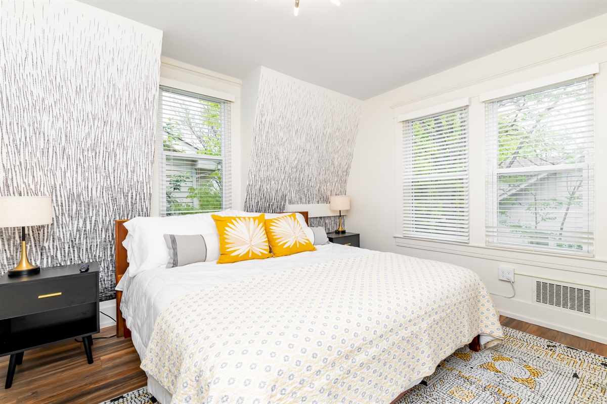 Each of our 4 bedrooms offers a unique and tranquil haven for rest and relaxation. The primary bedroom is just off the main living area and is decorated with richly colored walls, beautifully remodeled bath and a walk-in closet with washer and dryer. In case you work from “home”, there is a workspace provided with internet speeds to support all the devices your party might be using. Upstairs you will find three additional bedrooms just as richly and thoughtfully decorated, with another beautiful bathroom. There is also a second cozy, light-filled living room upstairs. High end luxury towels, bathroom amenities, and bedding throughout.