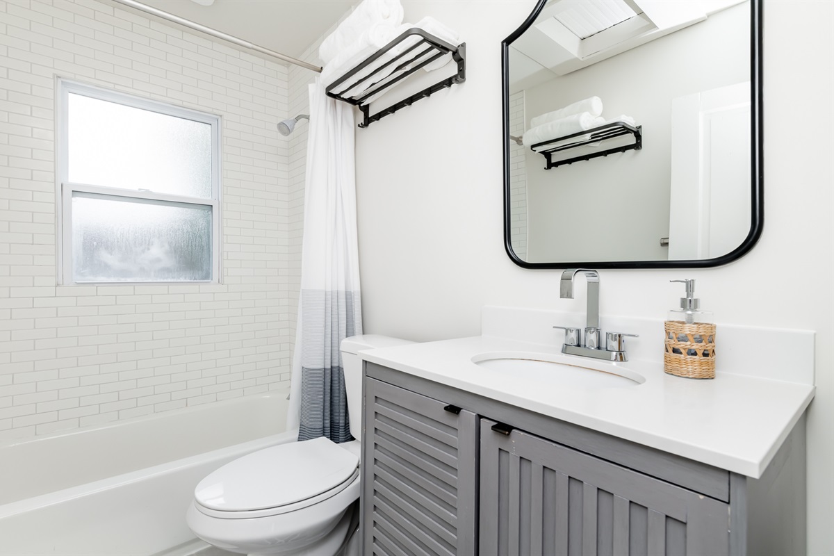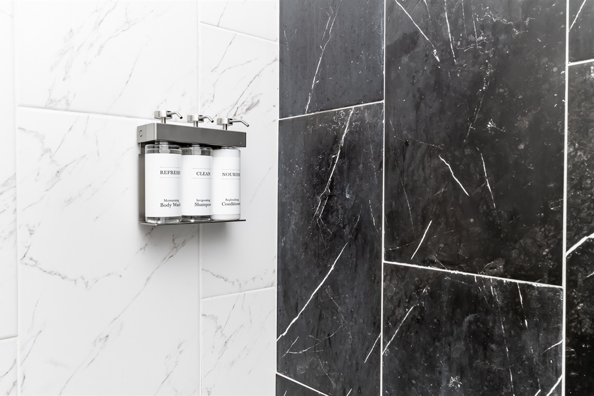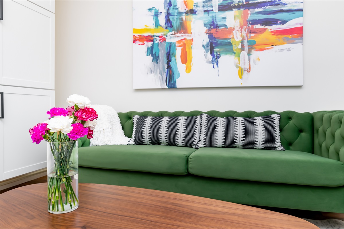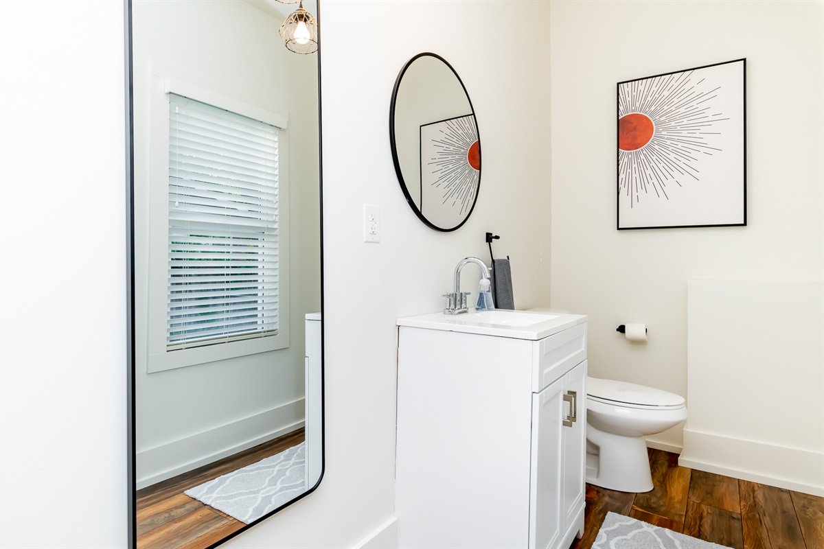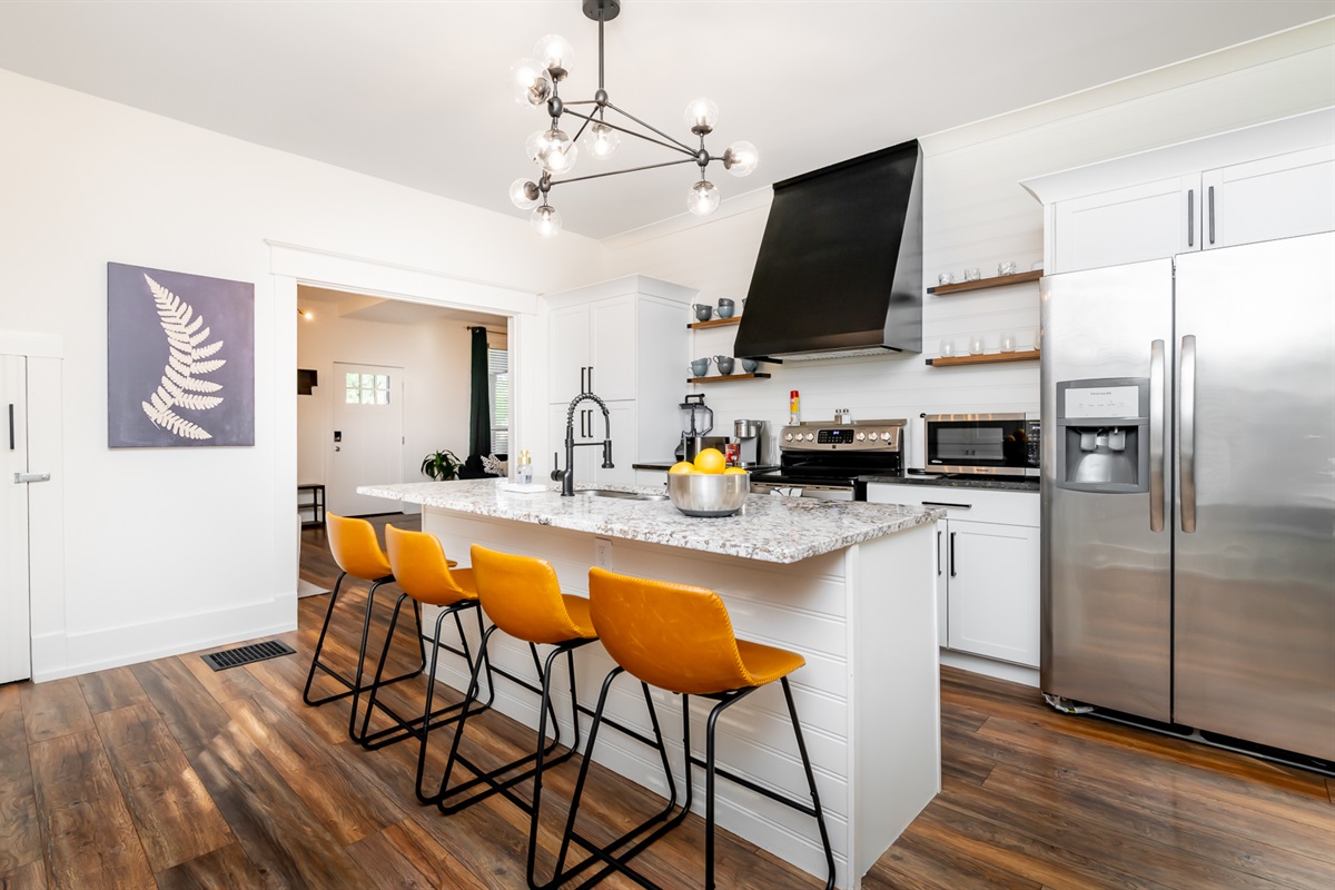 Each of our 4 bedrooms offers a unique and tranquil haven for rest and relaxation. The primary bedroom is just off the main living area and is decorated with richly colored walls, beautifully remodeled bath and a walk-in closet with washer and dryer. In case you work from “home”, there is a workspace provided with internet speeds to support all the devices your party might be using. Upstairs you will find three additional bedrooms just as richly and thoughtfully decorated, with another beautiful bathroom. There is also a second cozy, light-filled living room upstairs. High end luxury towels, bathroom amenities, and bedding throughout.