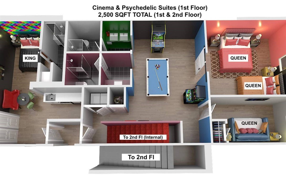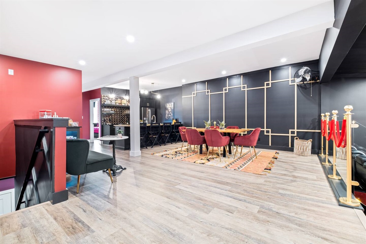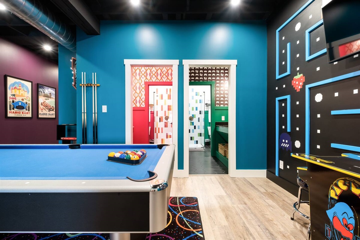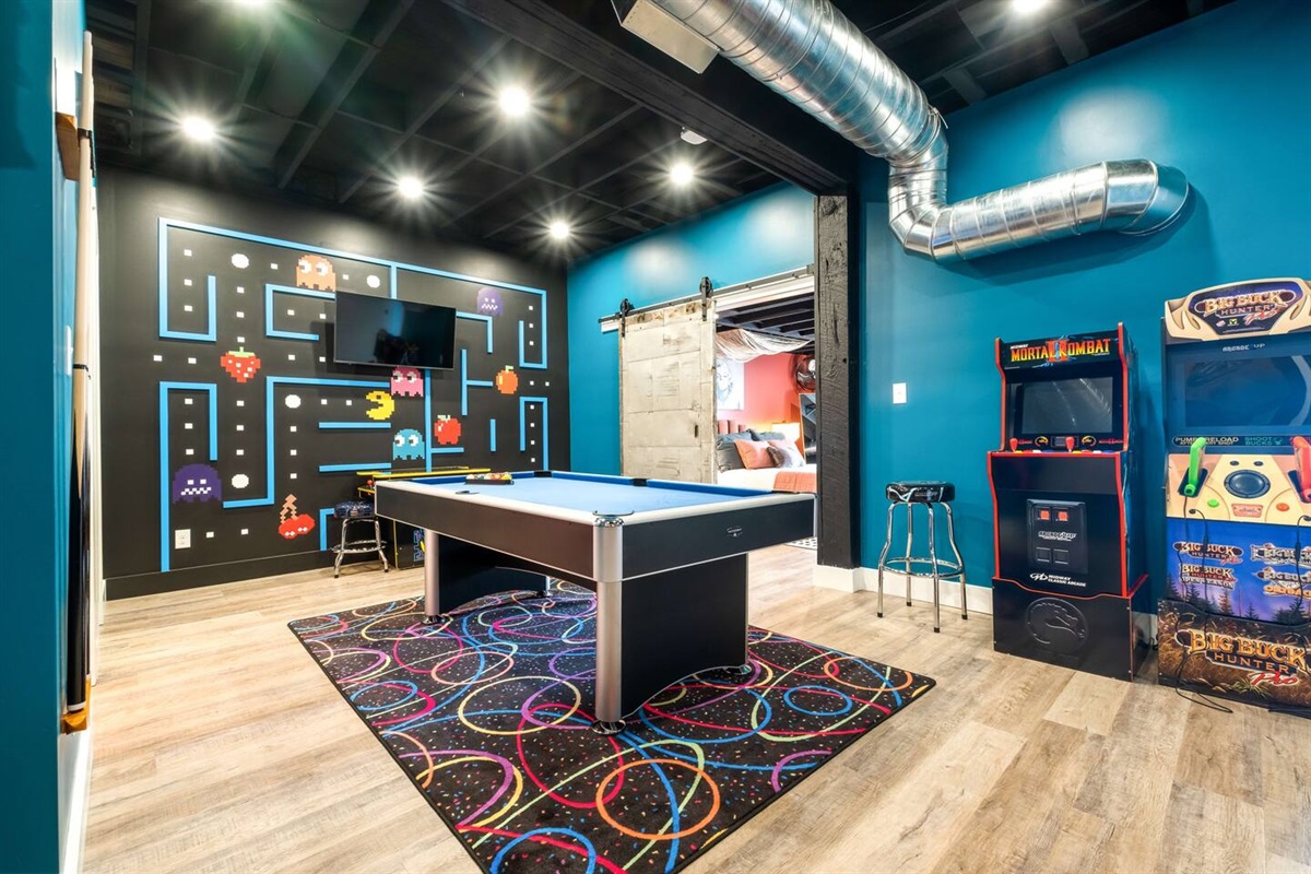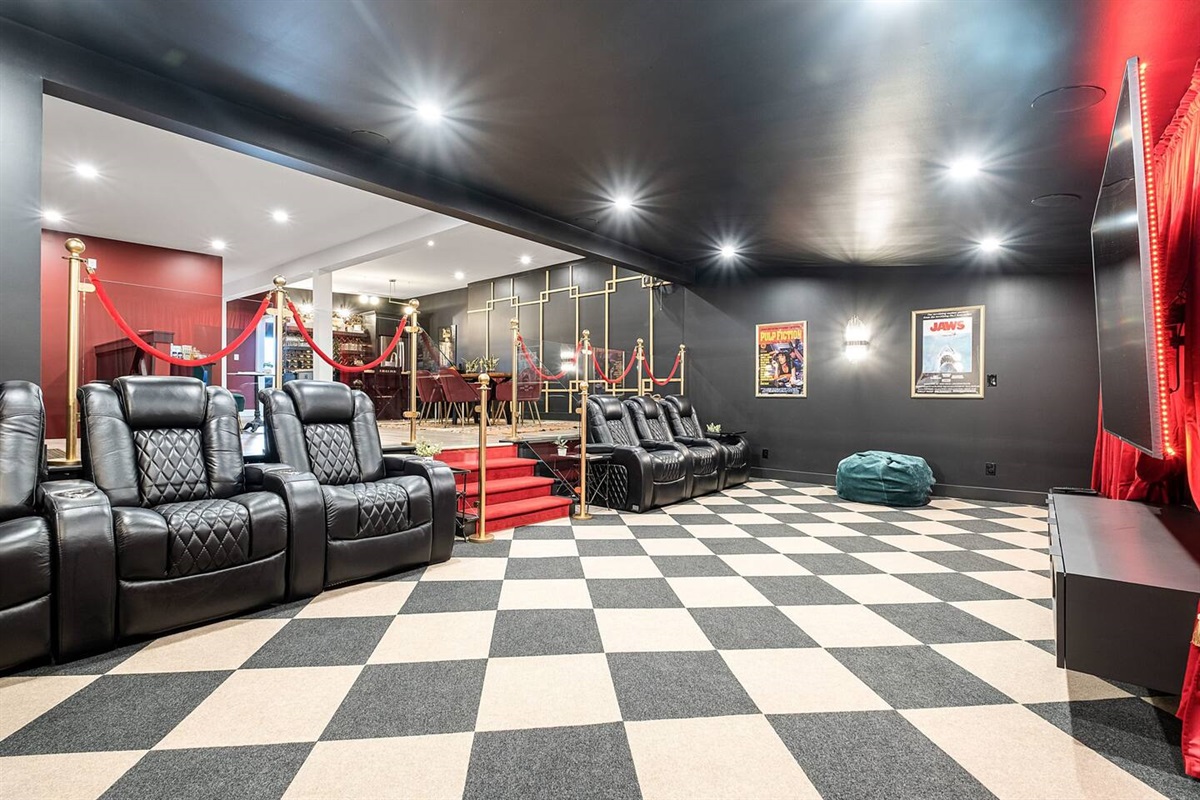 A 2-tier, 2,000 sq ft blockbuster suite! GIGANTIC 86” LED TV with Dolby 5.1 Surround, Theater Seating, and Arcade Room.