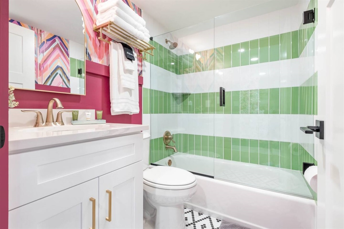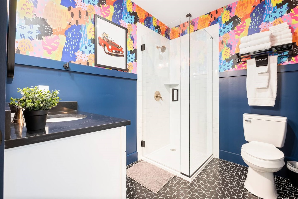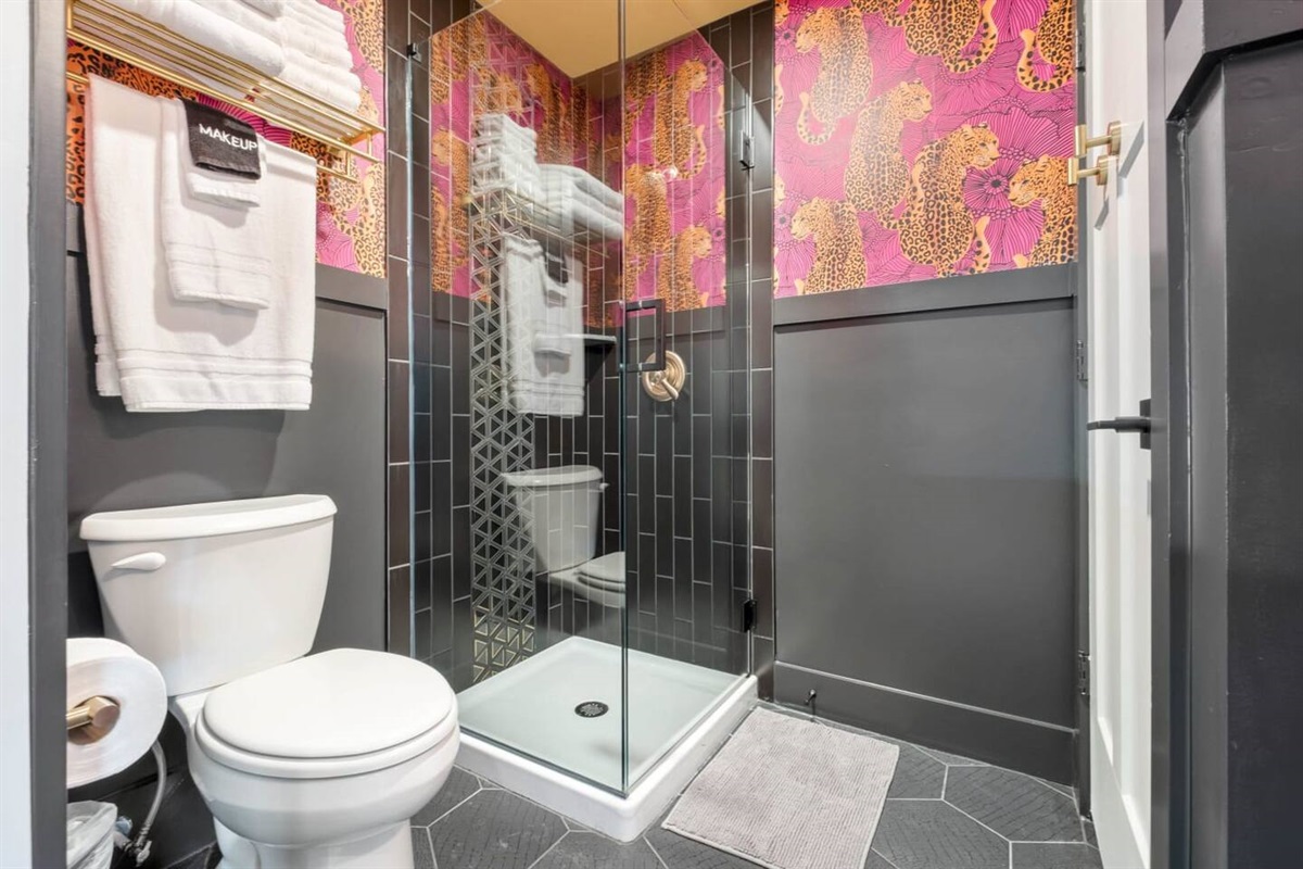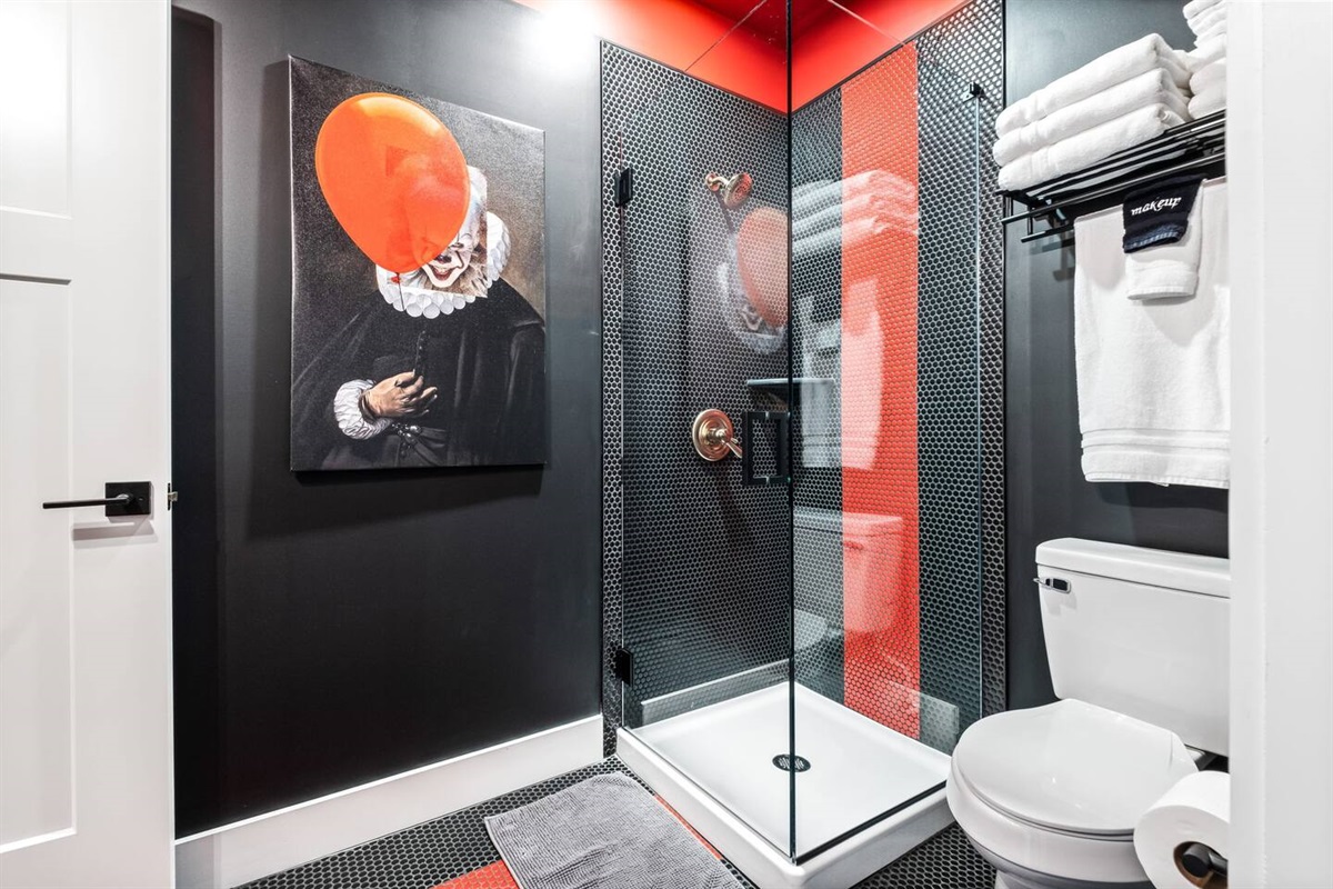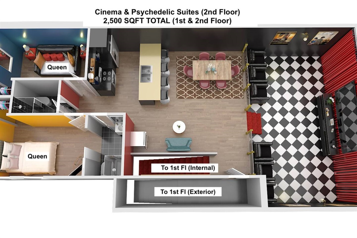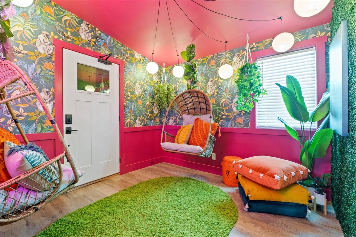 A 2-tier, 2,000 sq ft blockbuster suite! GIGANTIC 86” LED TV with Dolby 5.1 Surround, Theater Seating, and Arcade Room.