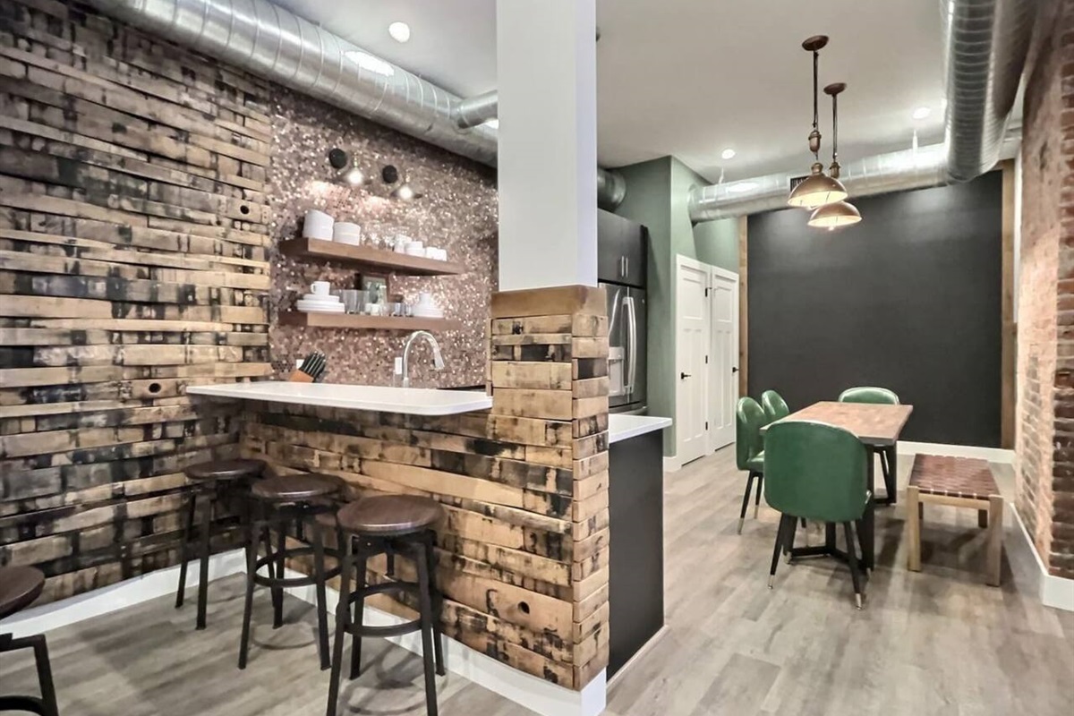 Vintage Pub-Style Suite sitting directly behind NEAT. Authentic bourbon staves and barrels submerse the space.
