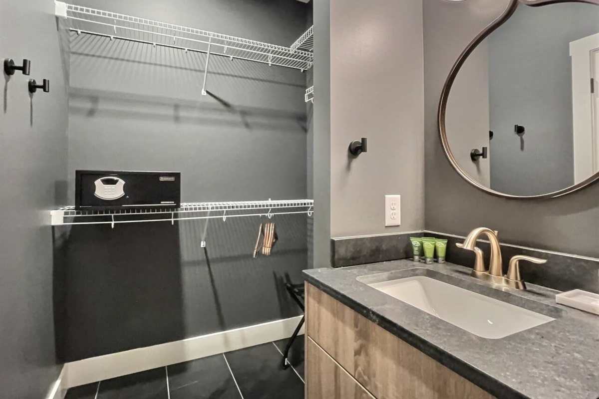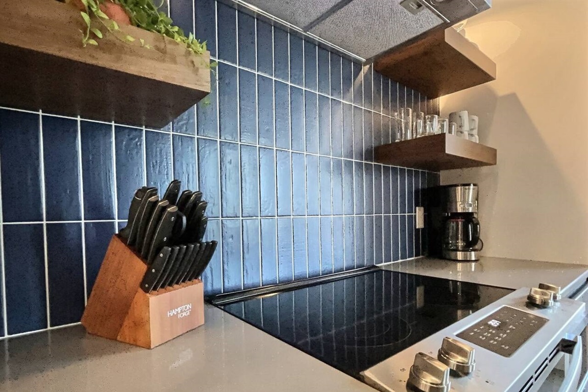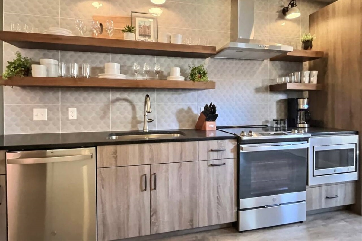 A well-orchestrated Full-Size Kitchen is ready with all the essentials for your next jam session, and oozes of color that would make the B.B. King proud. Open shelving, stone countertops, beautiful stainless-steel appliances and a custom bar top will leave you with a mic drop.