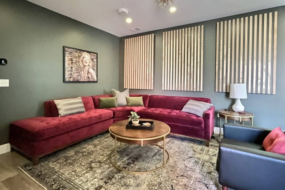 Dressed to Impress. Classy meets spunky in this provocative 2 Bedroom, 2 Full Bath suite that guarantees to tantalize your senses. Striking wood-tone cladding provides a posh contrast above the velvety, violet couch at the heart of this fashionable space. First-class finishes tastefully garnish a full-size kitchen with open shelving, rich stone countertops and beautiful stainless-steel appliances.