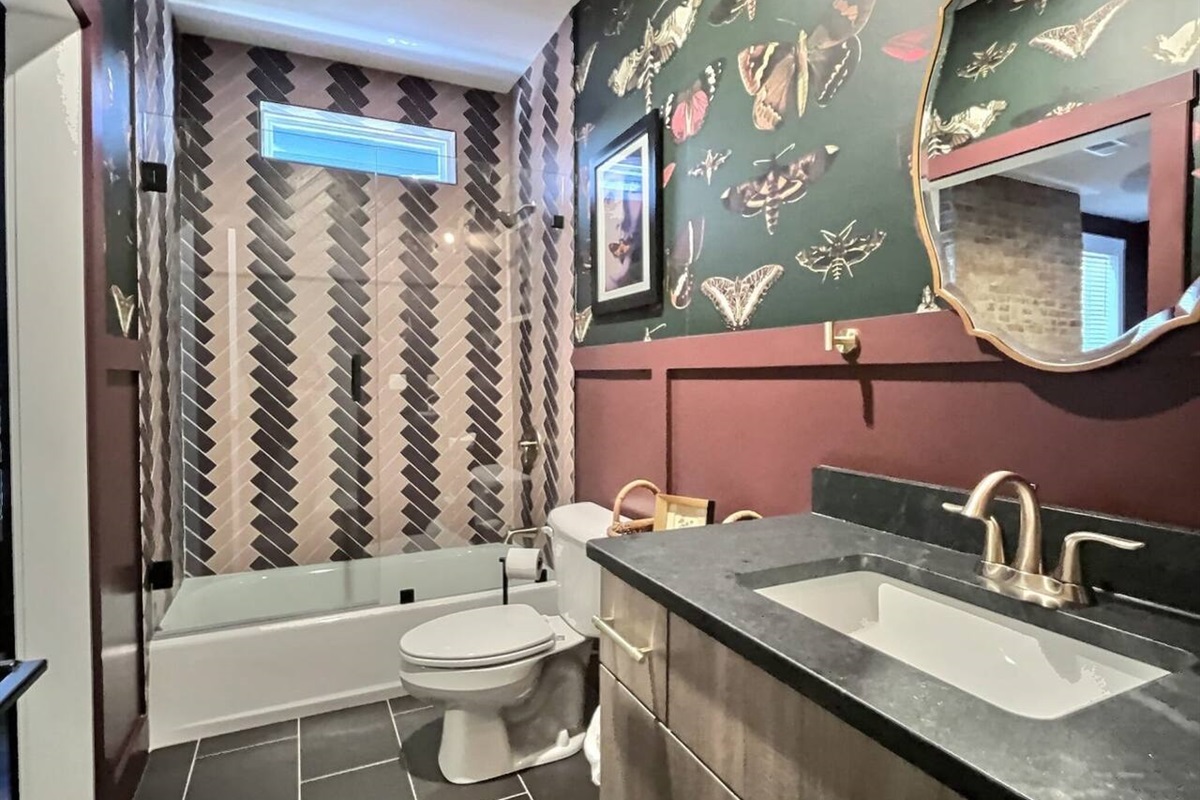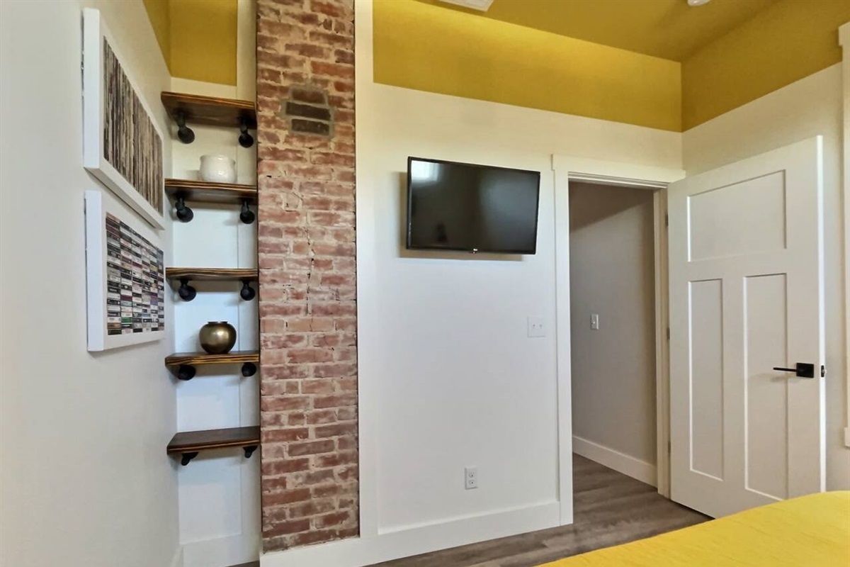 Glamping is made possible in the front bedroom that comes furnished with a Bunk Bed (Full Beds), wood desk and brick hearth. Uncanny butterfly wallpaper in the supporting bathroom draws on hints of Hannibal Lecter with a fascinating tiled shower to match. Cognac elements dress down the rear bedroom with Queen Bed and adjoining second full bathroom. Elegant. Bold. Swanky. Don’t be fashionably late, or you’ll miss out!