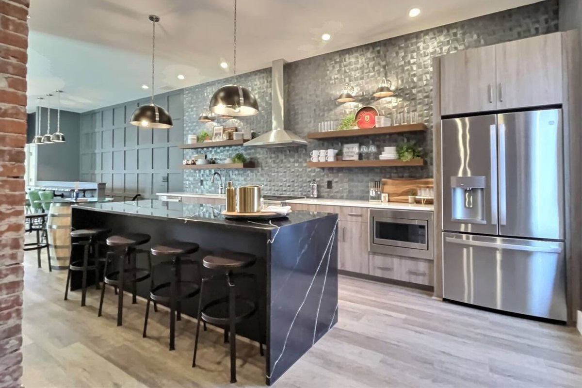 The sky is truly the limit! Our sprawling Rooftop Deck (750+ sqft) rests atop NEAT Bourbon Bar and grants a glimpse of Downtown Louisville in the backdrop. Seamlessly combine the indoor + outdoor living areas into one, cohesive gathering space compliments of the overhead bay door that glides open between the living room and rooftop deck. We brought sexy back in our R.E.M.A.R.K.A.B.L.E. powder room that portrays a certain photo-worthy quality fit for a designer magazine. Gold embellished black leather tile runs floor-to-ceiling, and accentuates a custom bourbon vanity (yes, the is bourbon real!). Original brick hearths deliver a warm touch and flank our frequently rotating artwork that has been carefully handcrafted by a local artist.