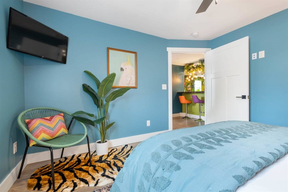 The hunt is over! Come monkey around in our infamous Jungalou @ Bungalou that promises to deliver a big-game feel thanks to 1,200+ SQFT that spans across a lush and outlandish wilderness. This 2nd floor canopy welcomes you to a tropical climate with hanging chairs, thicket walls and exotic bathrooms sure to impress any King of the Jungle. A full-sized watering hole (kitchen), bar top seating and an expansive living room makes entertaining is a breeze. Whether you’re a nocturnal creature, or just seeking hibernation, you’ll appreciate the 2 plush habitats furnished with memory foam beds for nesting. You’d be lion-to-yourself if you did not migrate your flock to come experience this wild expedition. Hurry up before your desired dates become extinct!