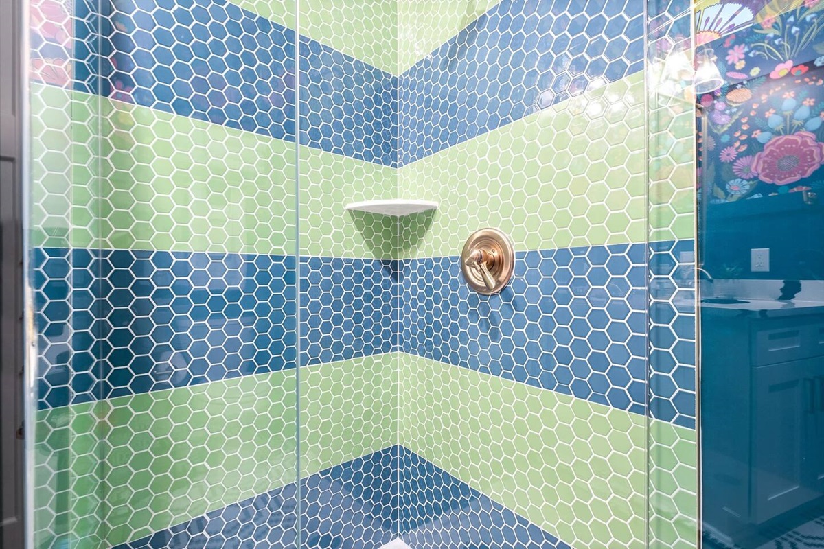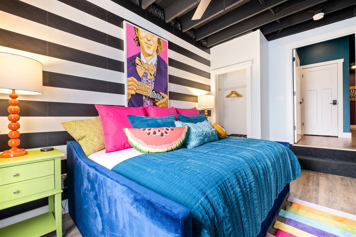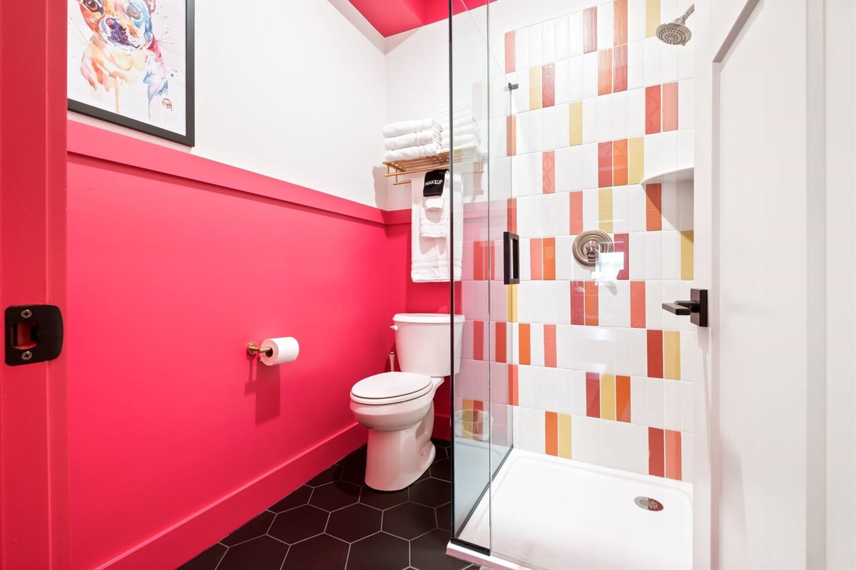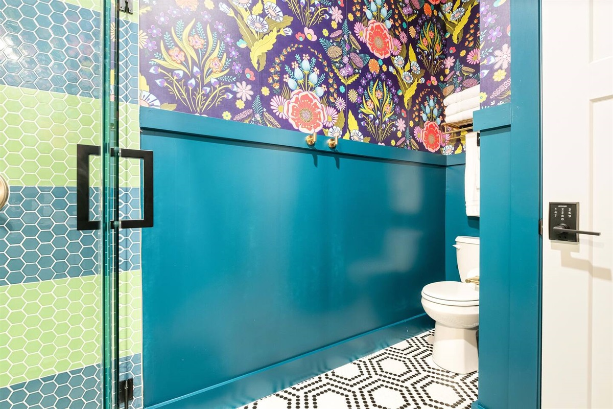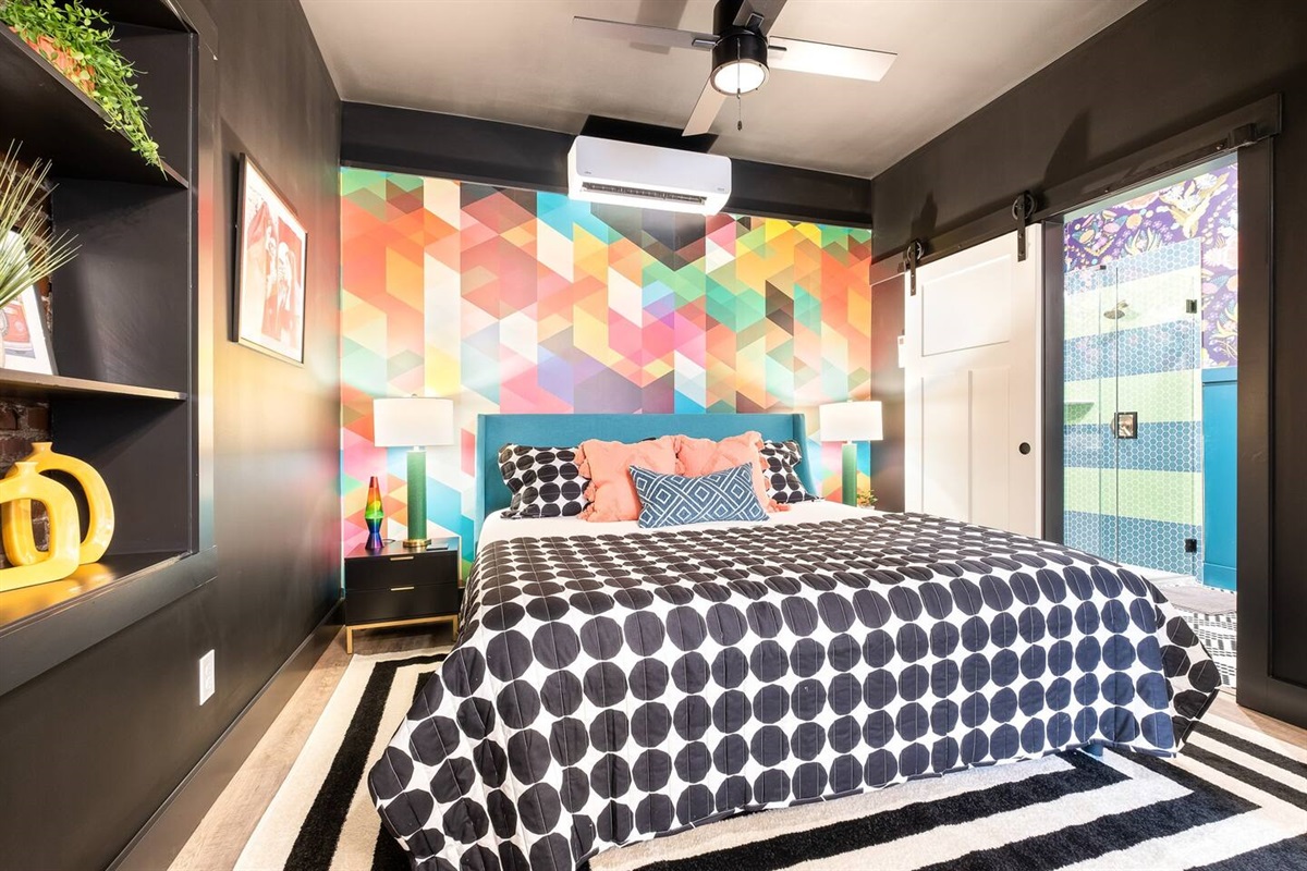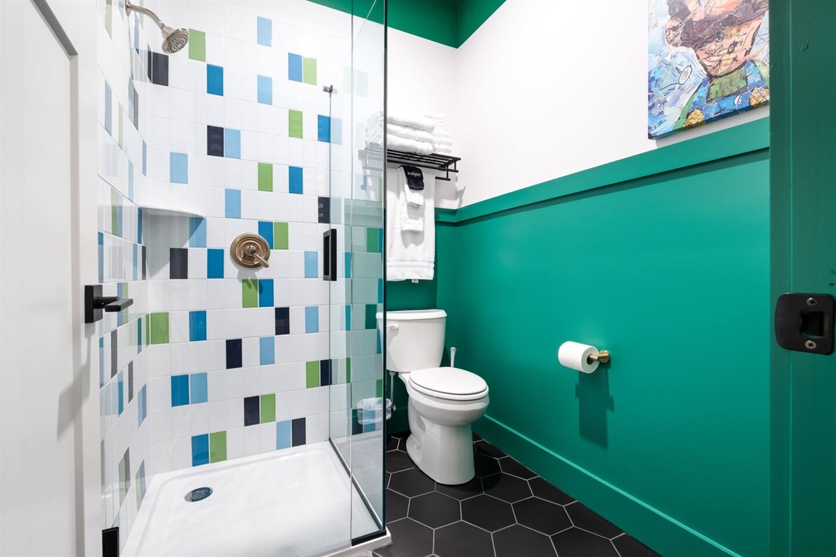 Positive vibes radiate throughout this 325 sqft Funky+Fresh joint. A Groooovy, Kaleidoscope wall floats behind a blissful King Bed that promises all the feels of peace, love and happiness. Trippy, lime green tile runs the full length of the kitchenette backsplash…because…why not?? Plus, a mini-fridge and microwave ensures you’ll be well-equipped for those late-night munchies (farrrr out!). “Flower Power” is bursting from the seams of this ensuite that would surely make John Lennon blush. No longer be dazed-n-confused…stay here and we’ll catch ya on the flip side. Peeeace!
