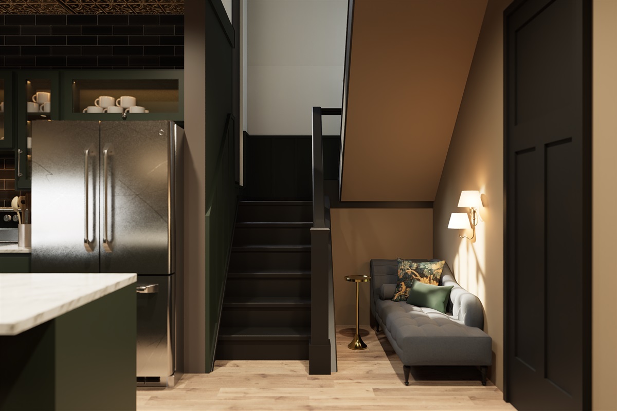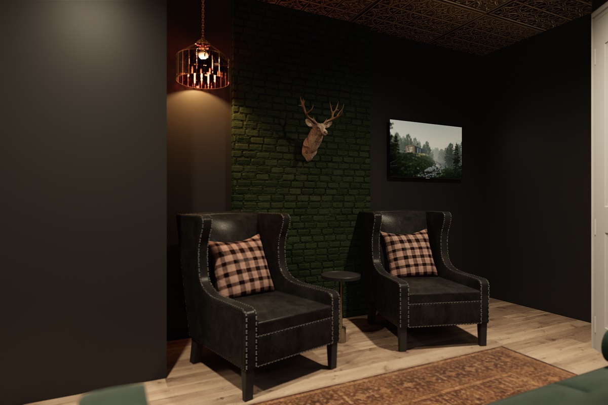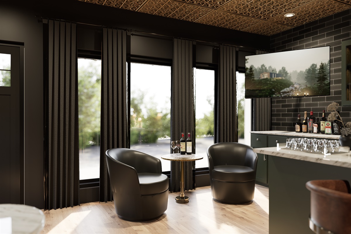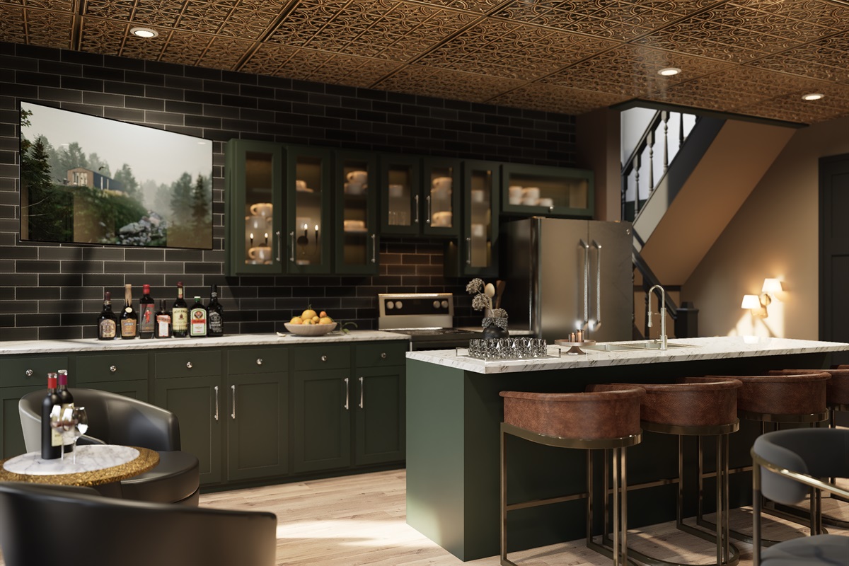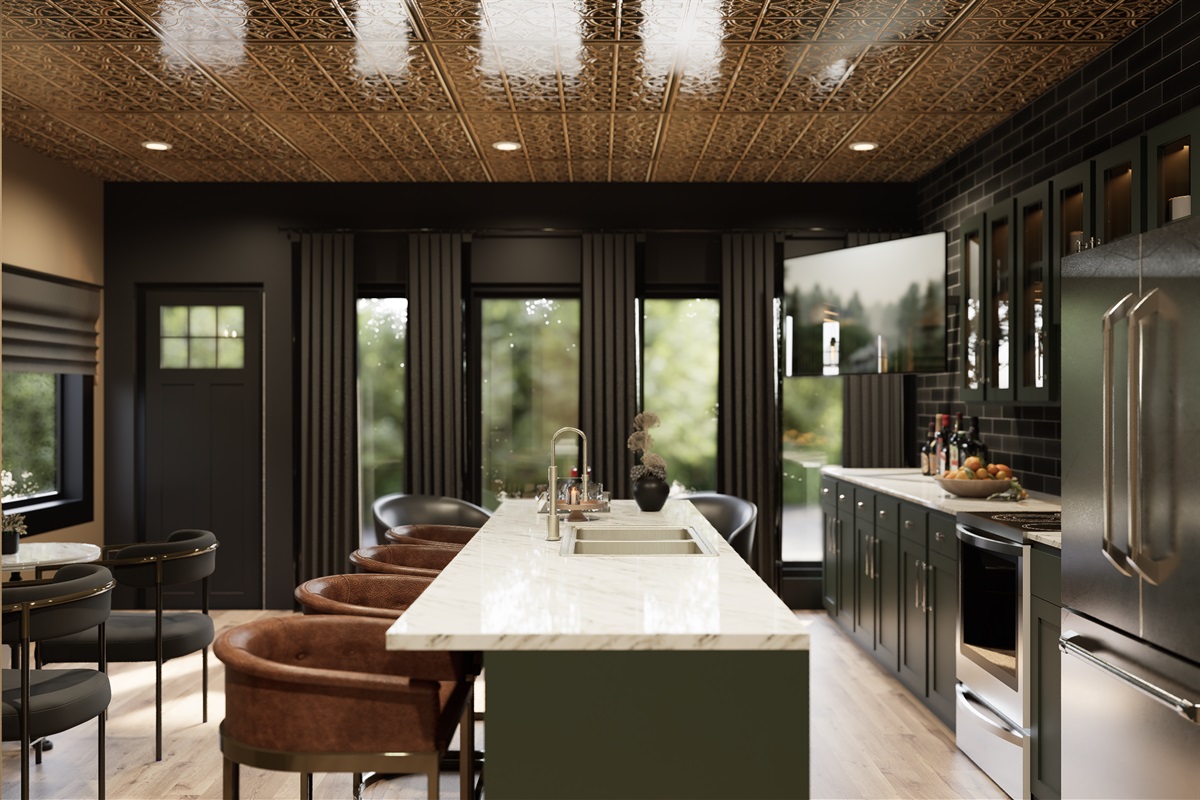The kitchen/lounge is a true showstopper, equipped with everything you need to cook, cater, or simply gather around the oversized island. Featuring stainless steel appliances, a Keurig with coffee pods and creamer, ample cookware, and plenty of dishware, it’s a central hub for the whole group.