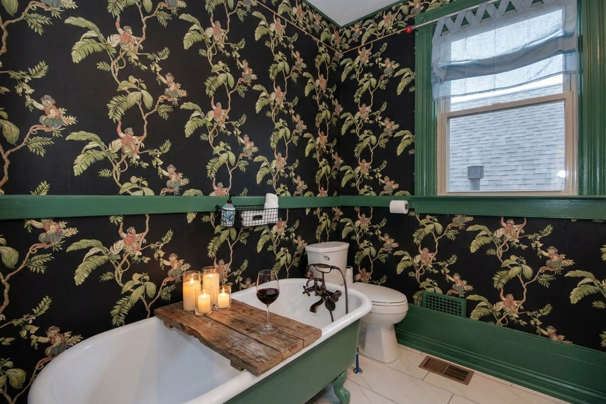 Bathrooms include tiled walk-in showers, a charming clawfoot tub, and double vanities—perfect for groups getting ready at once.