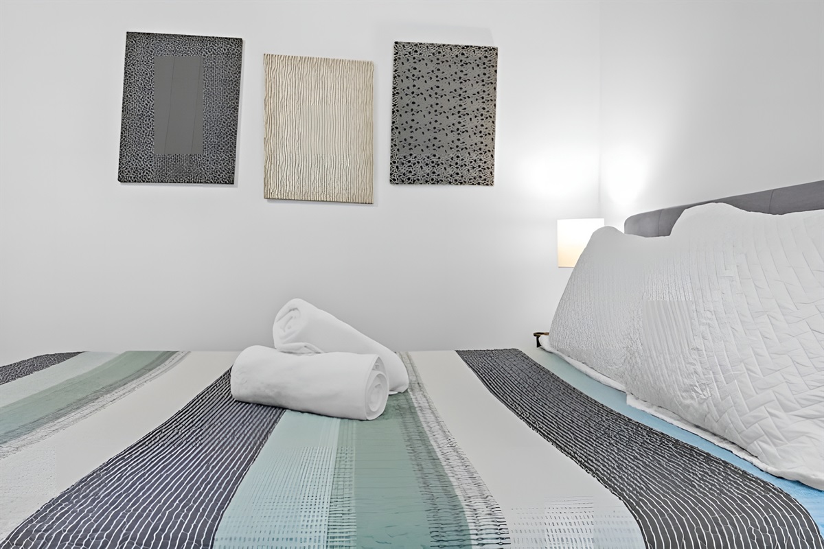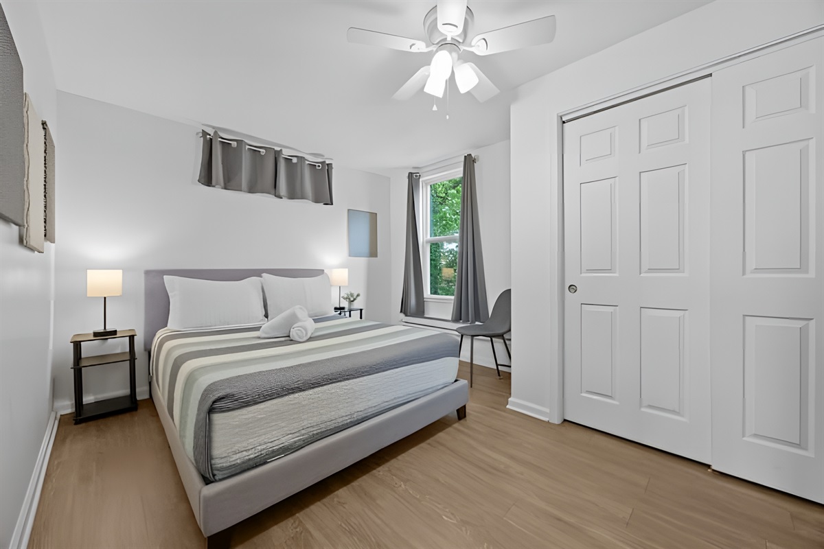▻ Bedroom with queen bed, full-body mirror, and closet w/ iron. 🛏️✨