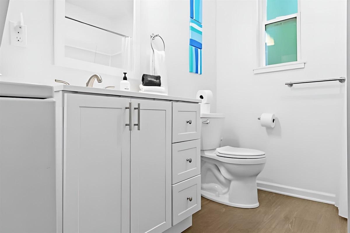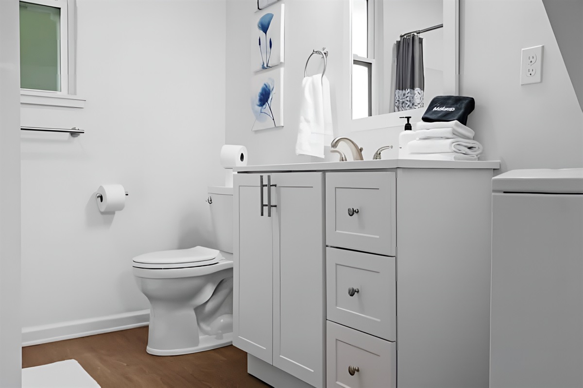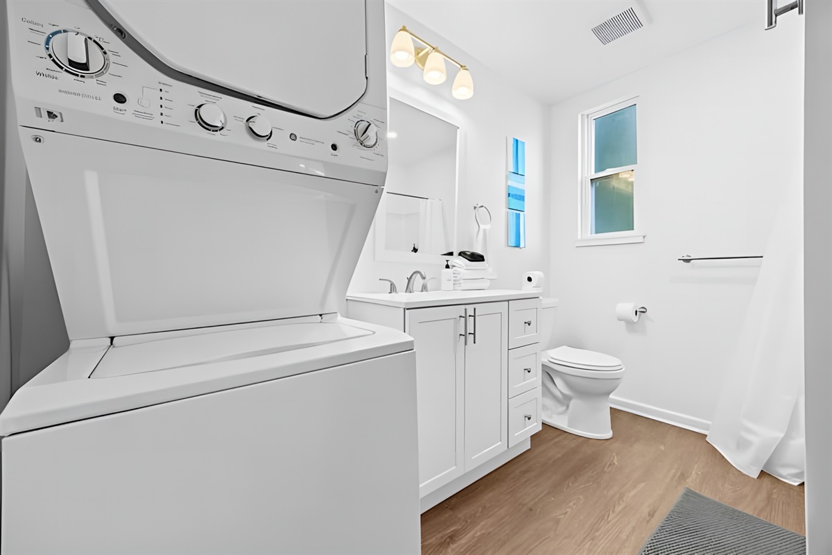 ▻ Full bath with washer/dryer, sink + mirror, toilet, and tub. 🛁