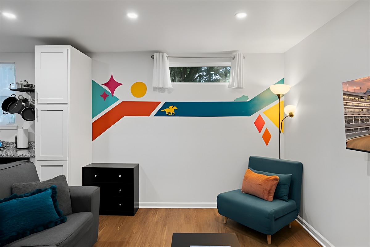 ▻ Bright living room with a futon bed, daybed chair, and Roku smart TV. 📺
