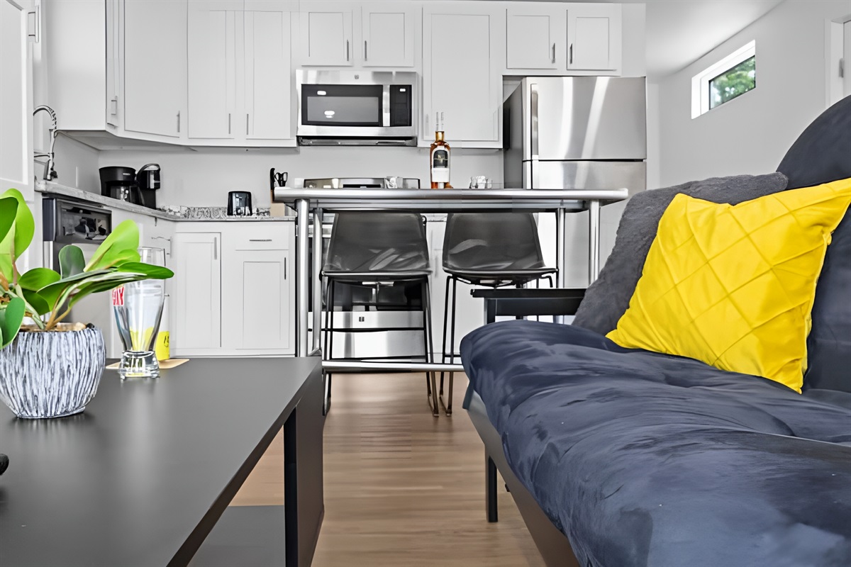 ▻ Kitchen stocked with essentials: stove, oven, refrigerator, microwave, cookware, drip coffee maker, Keurig, and dishwasher. 🍳