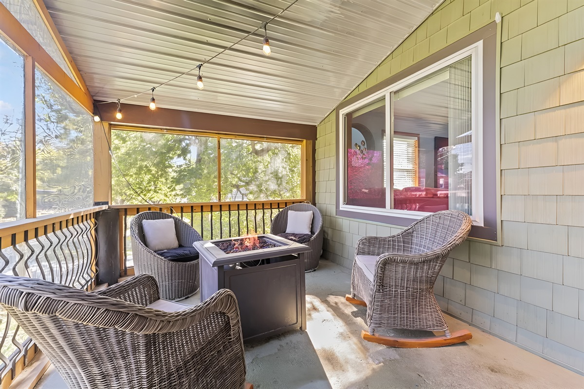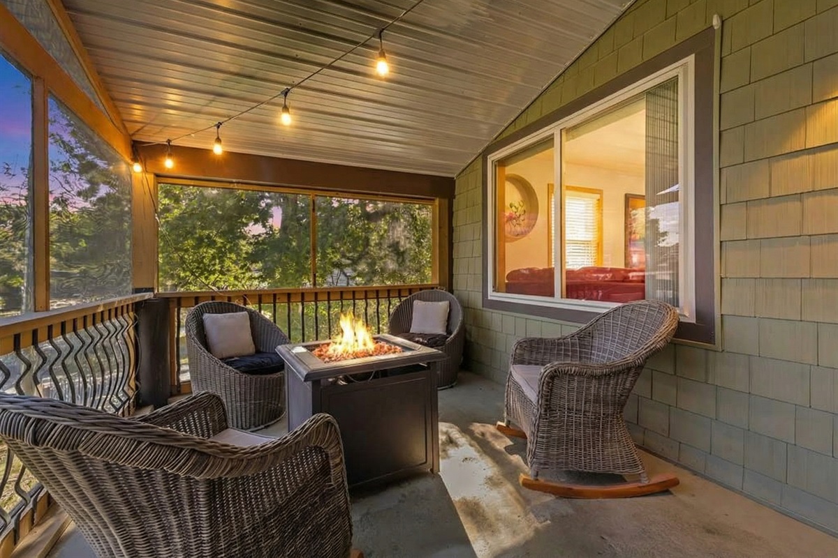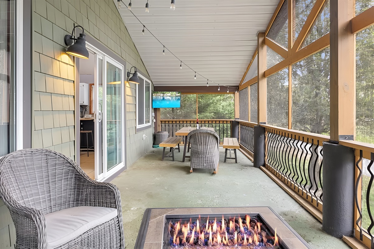 • Outdoor Patio (2nd Floor): Screened patio with comfortable seating, firepit, and dining table with TV.