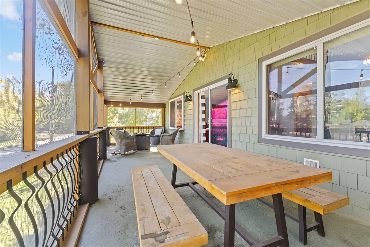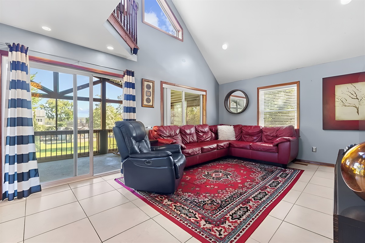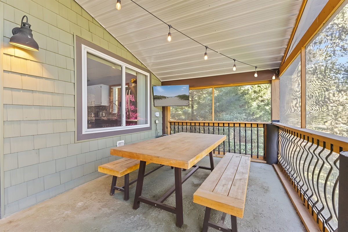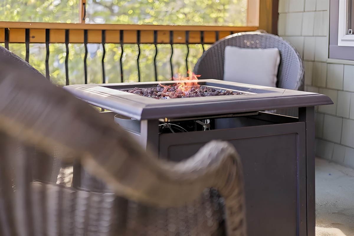 • Outdoor Patio (2nd Floor): Screened patio with comfortable seating, firepit, and dining table with TV.