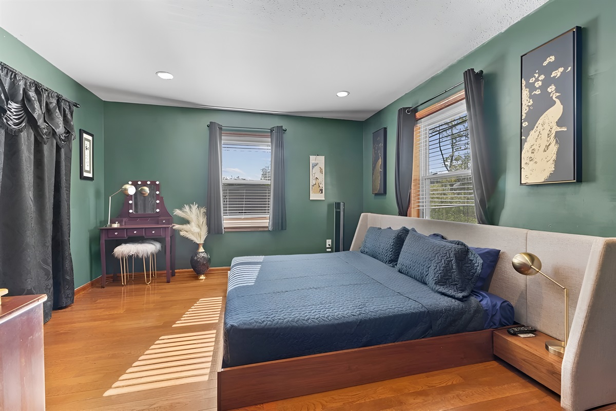 • Bedroom 1 (2nd Floor): King-sized bed, vanity, and desk area.