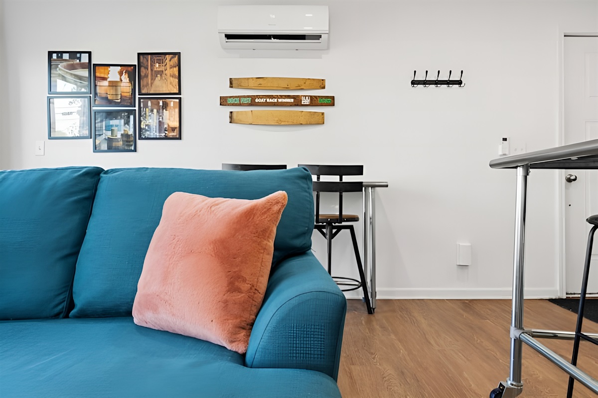 • Living Room: Features a futon bed, daybed chair, and Smart Roku TV.