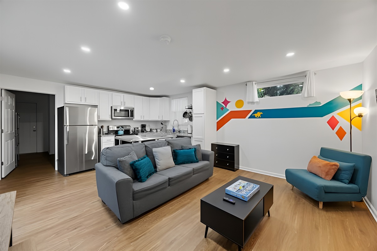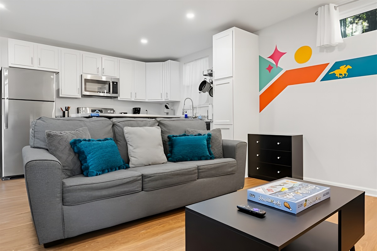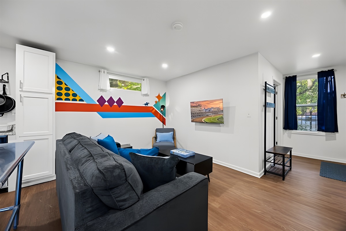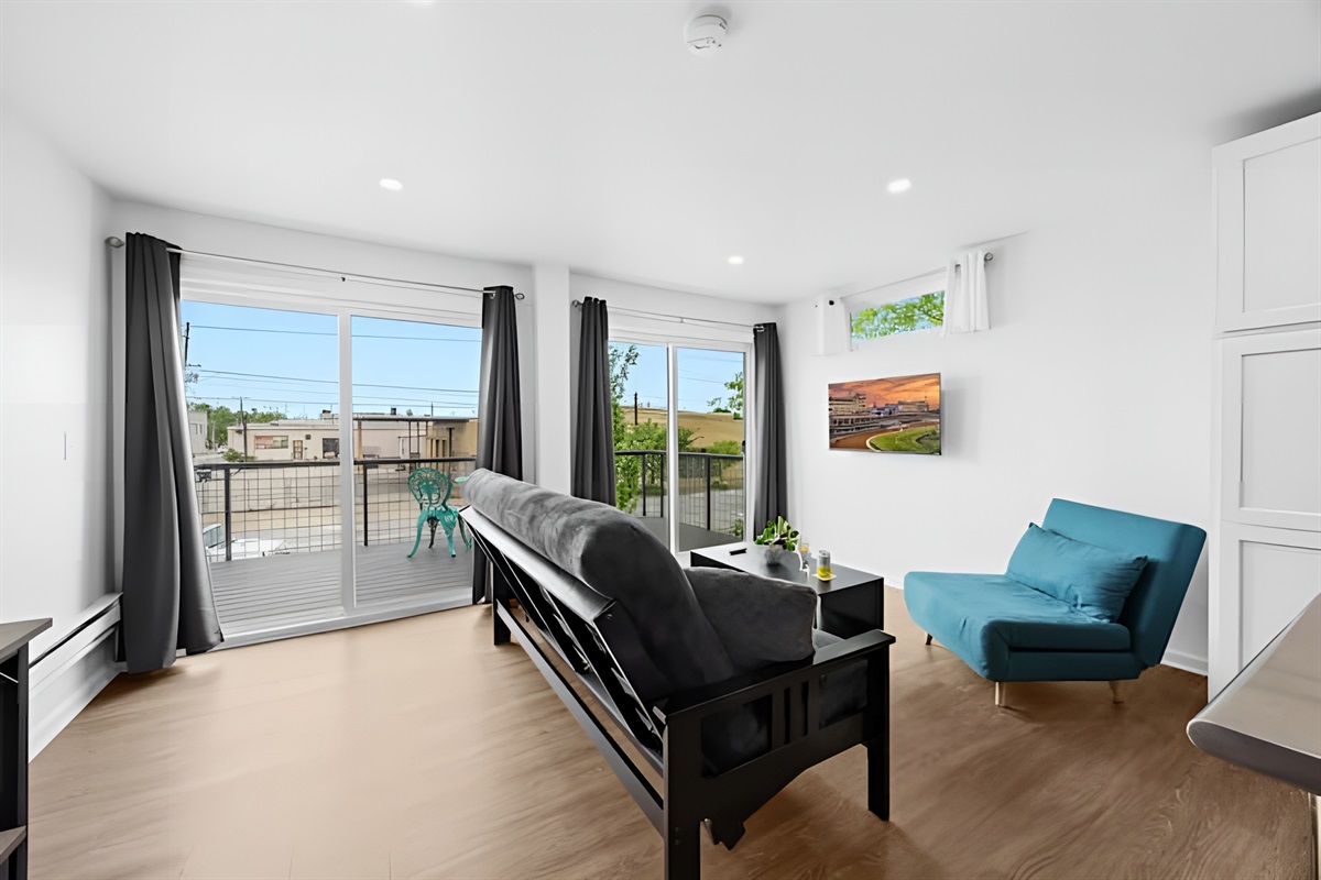 • Living Room: Comfortable seating area featuring a sleeper sofa, daybed chair, and Smart Roku TV.