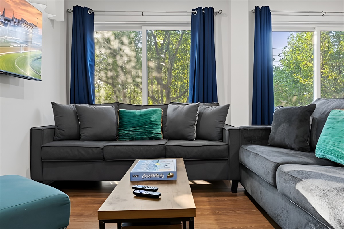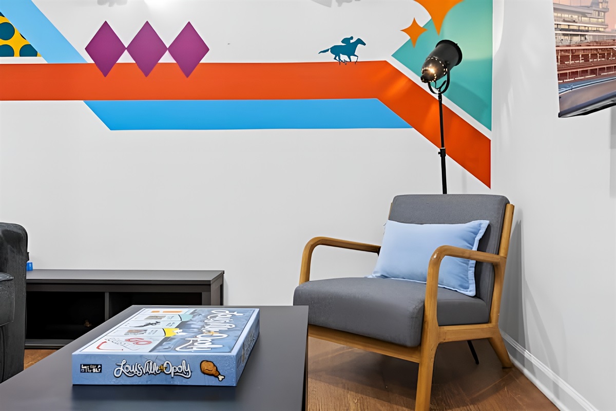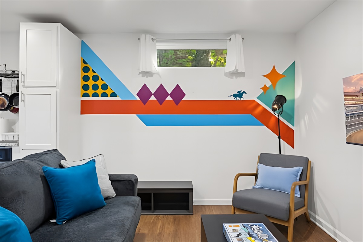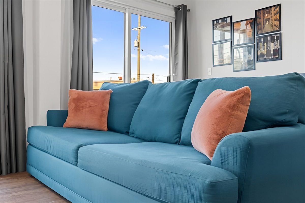 • Living Room: Comfortable seating area featuring a sleeper sofa, daybed chair, and Smart Roku TV.
