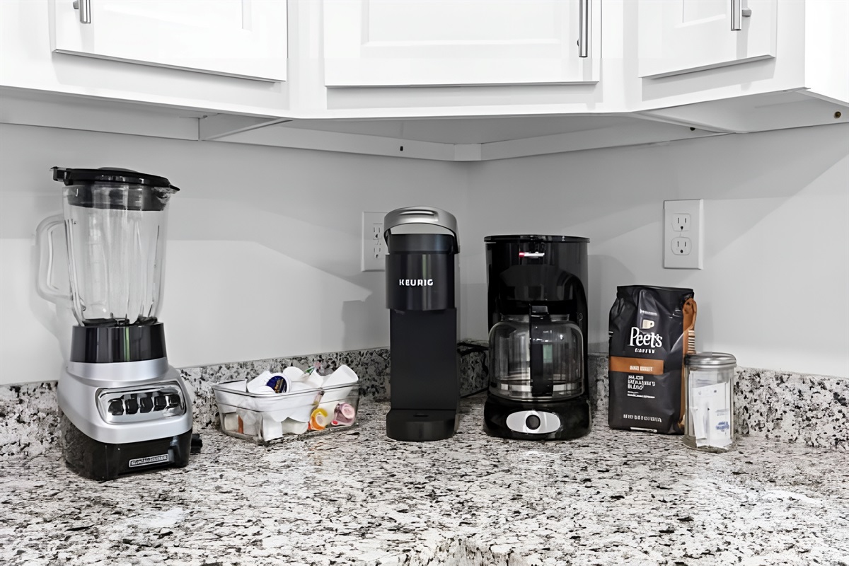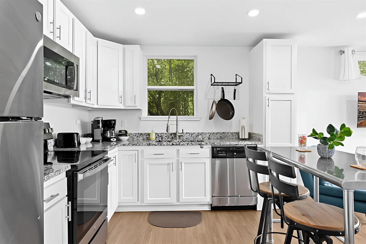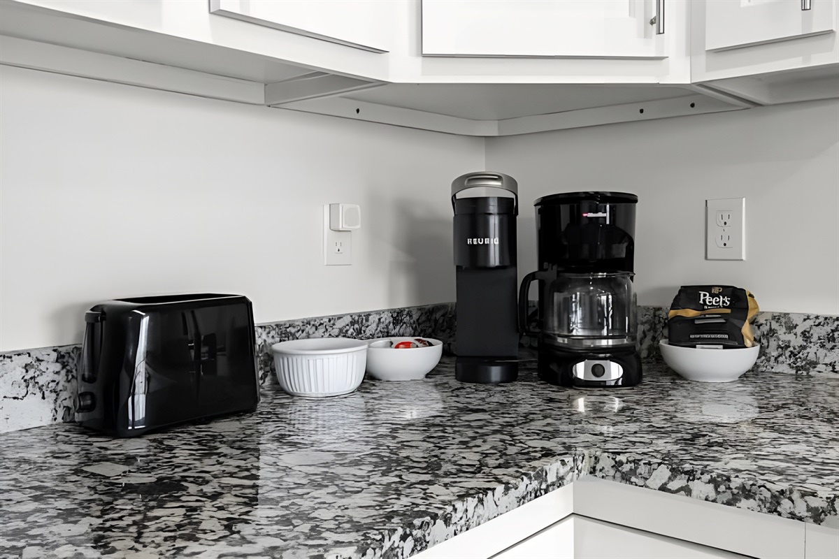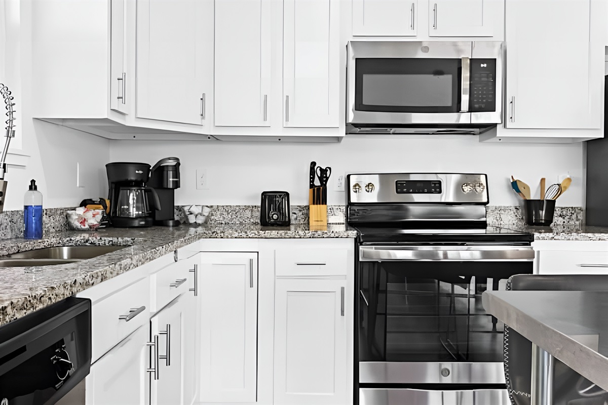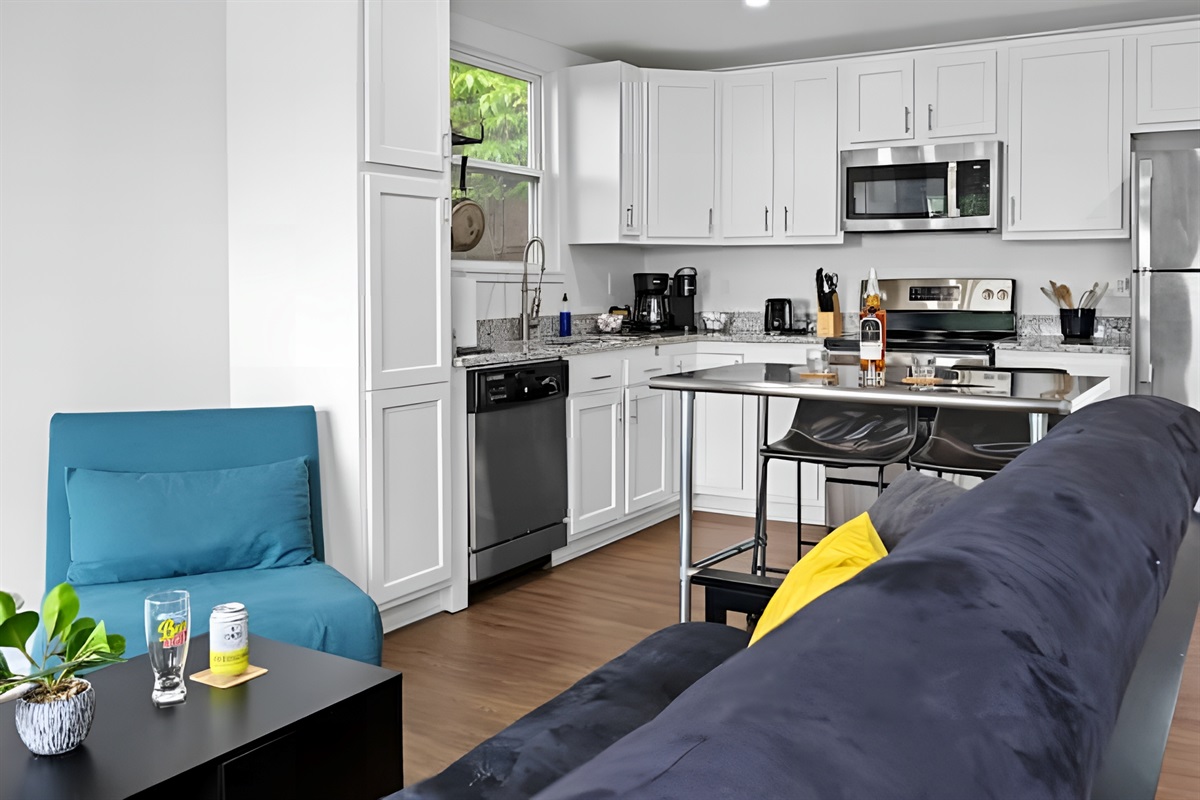 • Kitchen: Fully equipped with stove, oven, fridge, microwave, dishwasher, and both Drip & Keurig coffee makers.