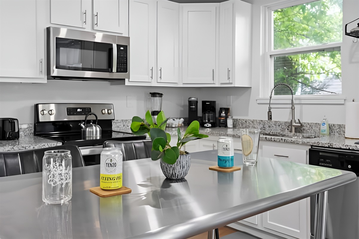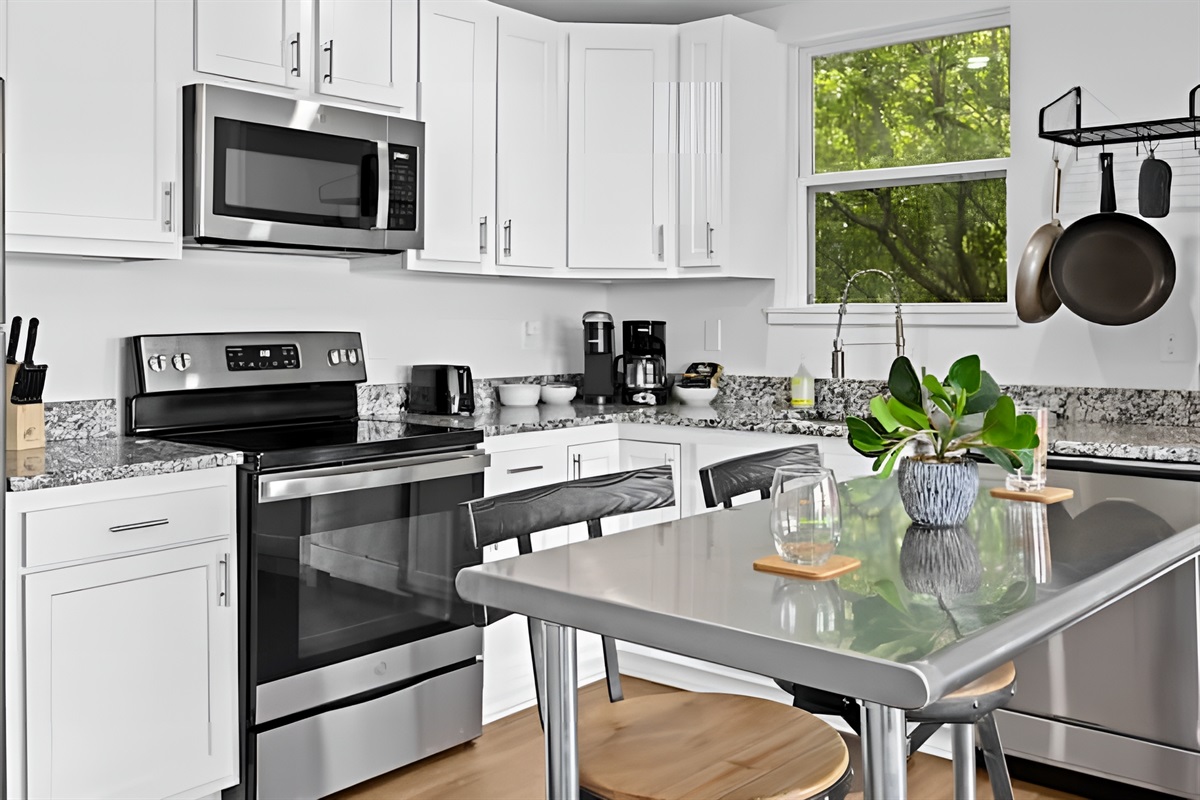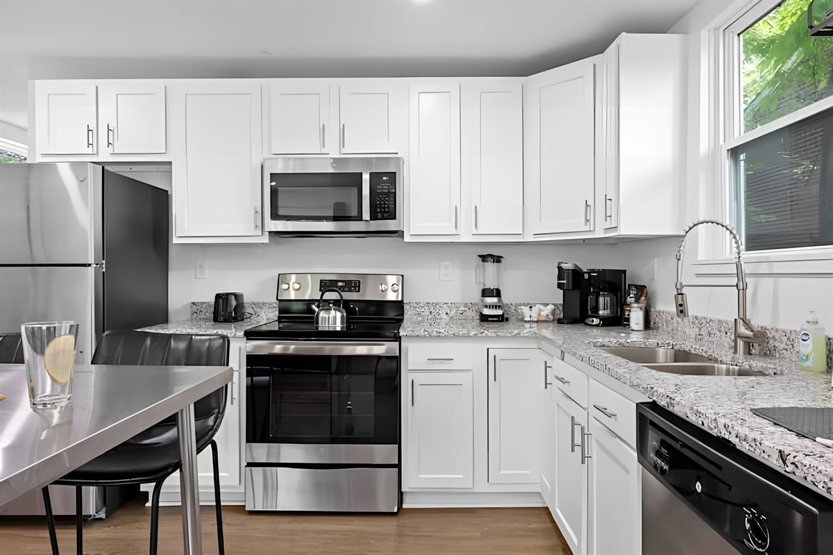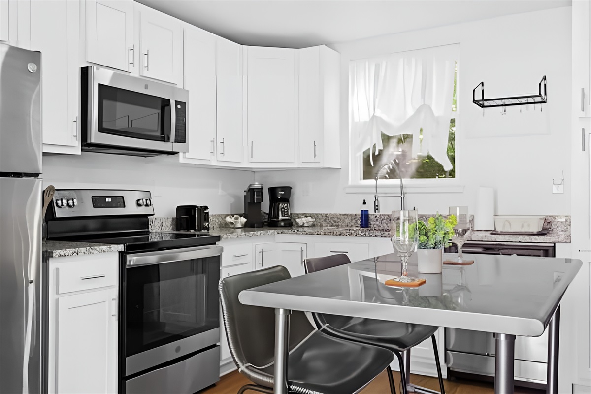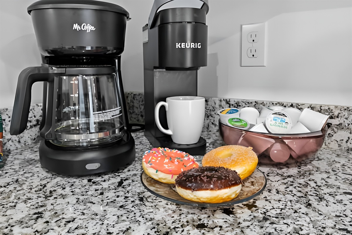 • Kitchen: Fully equipped with stove, oven, fridge, microwave, dishwasher, and both Drip & Keurig coffee makers.