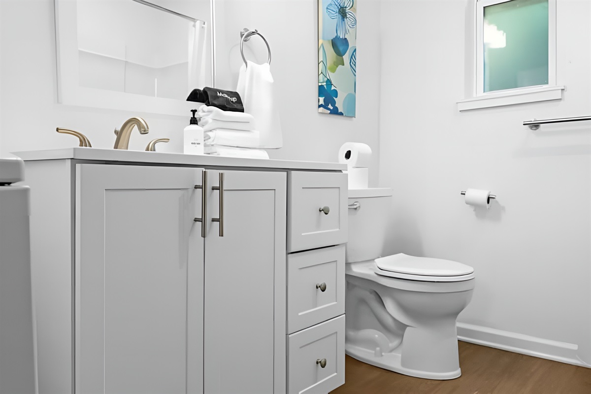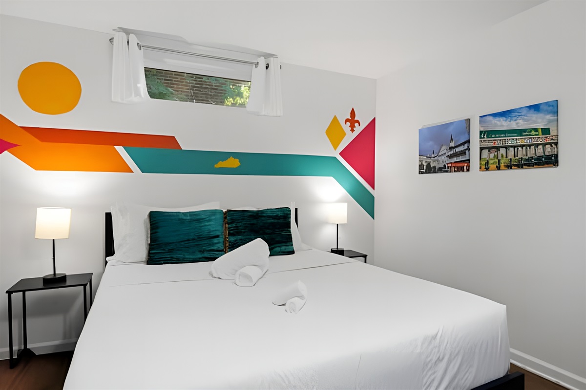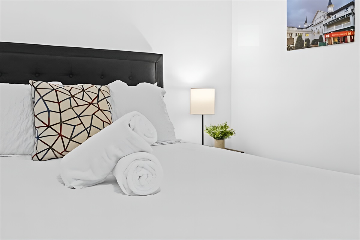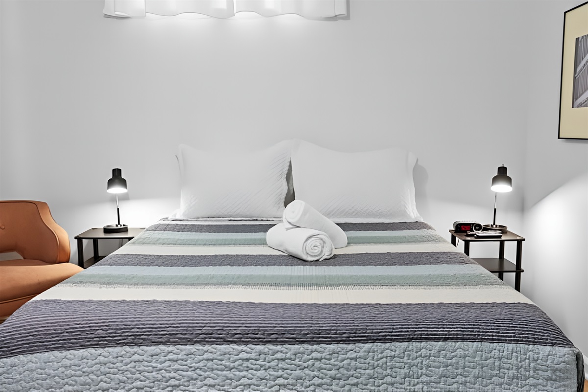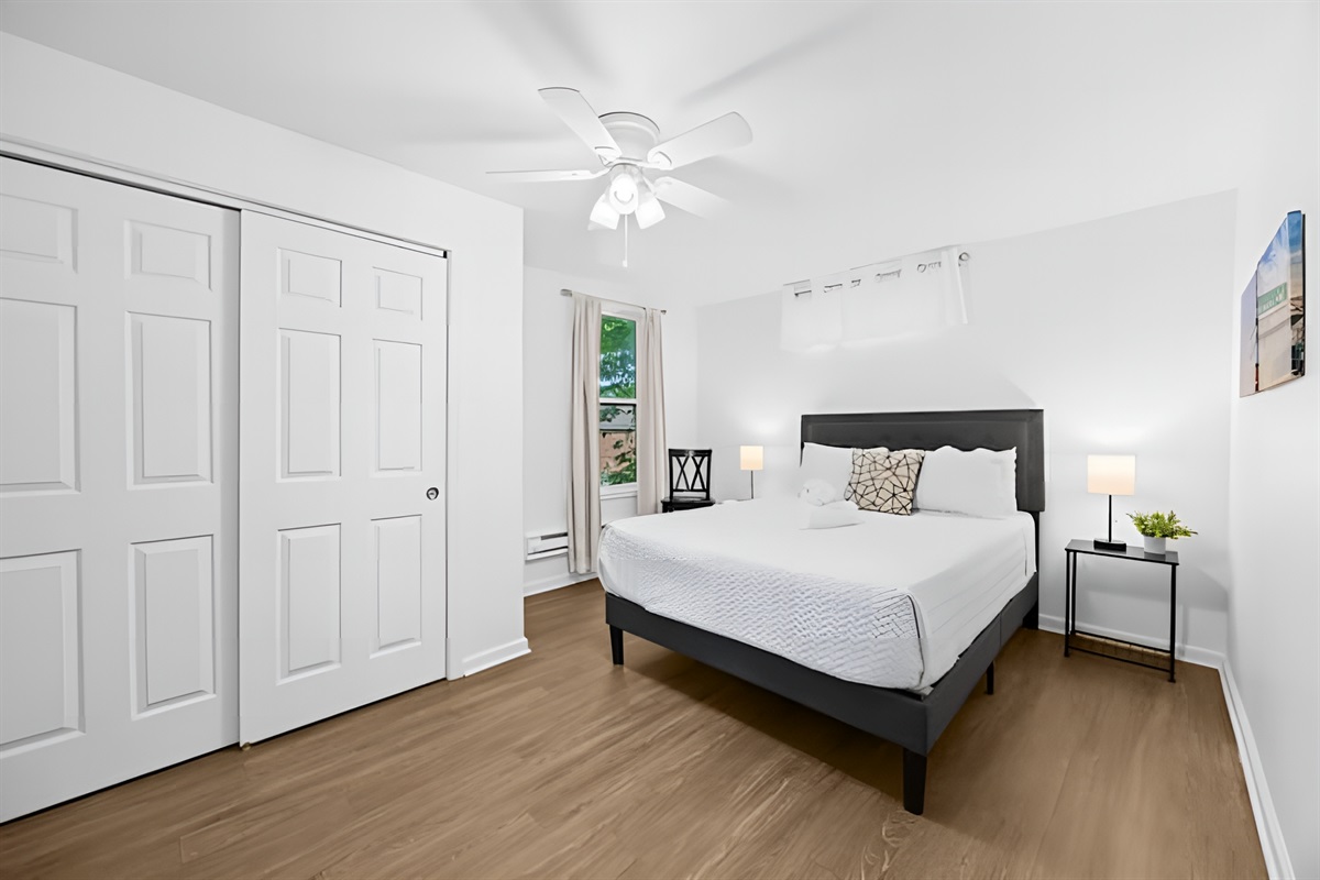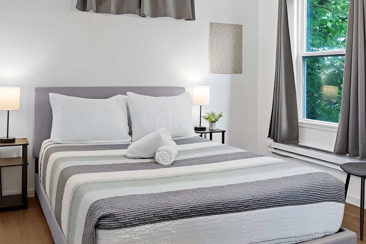 • Bedroom: Features a Queen sized bed, full length mirror, and closet with iron.