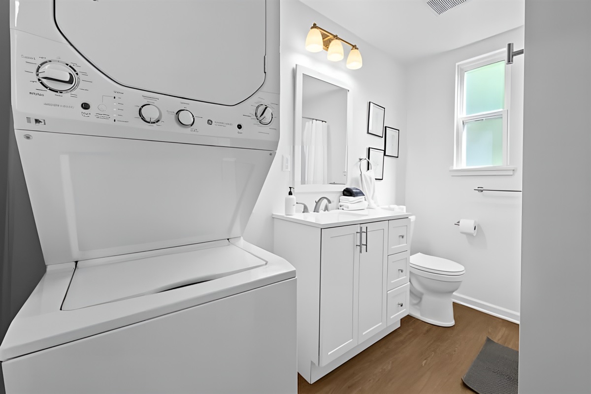 • Bathroom: Full bath with bathtub, sink, toilet, and in unit washer and dryer.