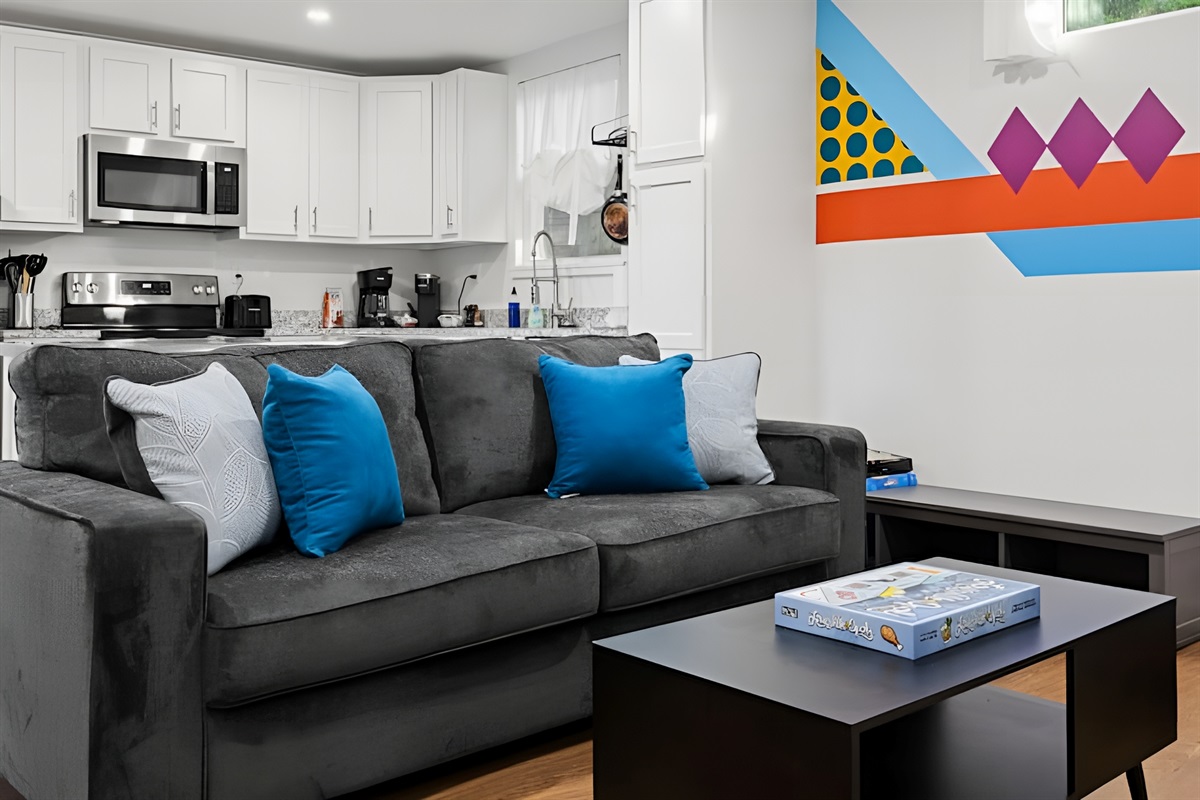 • Living Room: Comfortable seating area featuring a sleeper sofa and a daybed chair. Relax with the smart Roku TV.