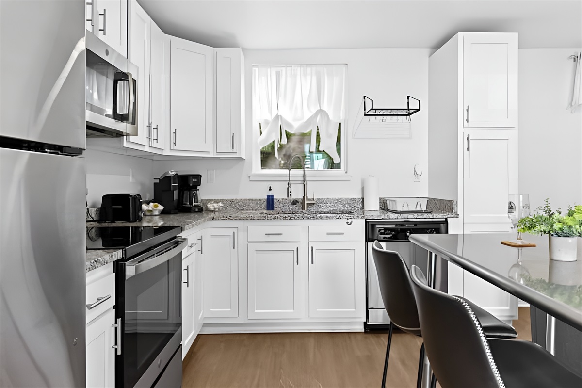 • Kitchen: Fully equipped with stove, oven, fridge, microwave, dishwasher, and both drip and Keurig coffee machines. Includes basic cookware and dishes.
