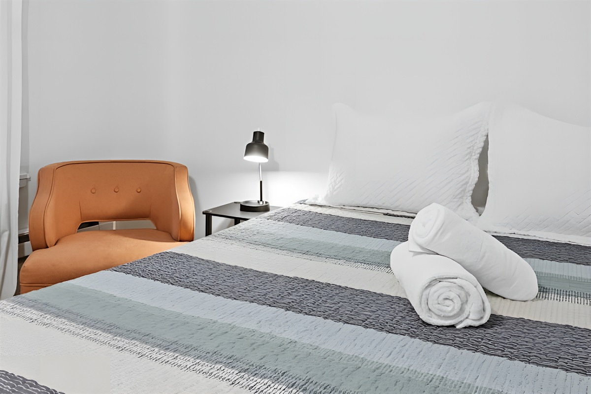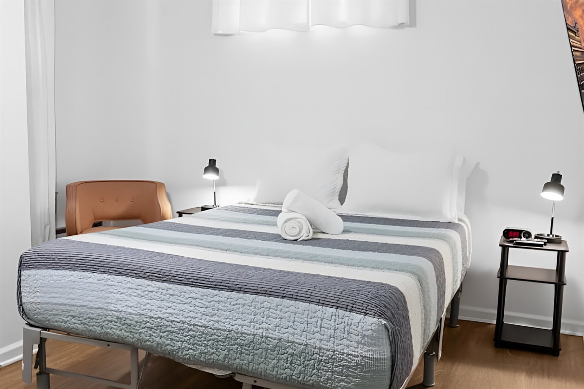 • Bedroom: Features a queen sized bed, full length mirror, and closet with iron.