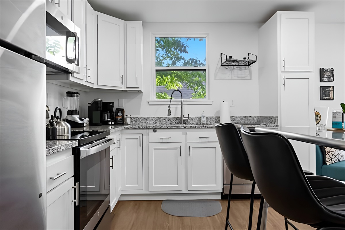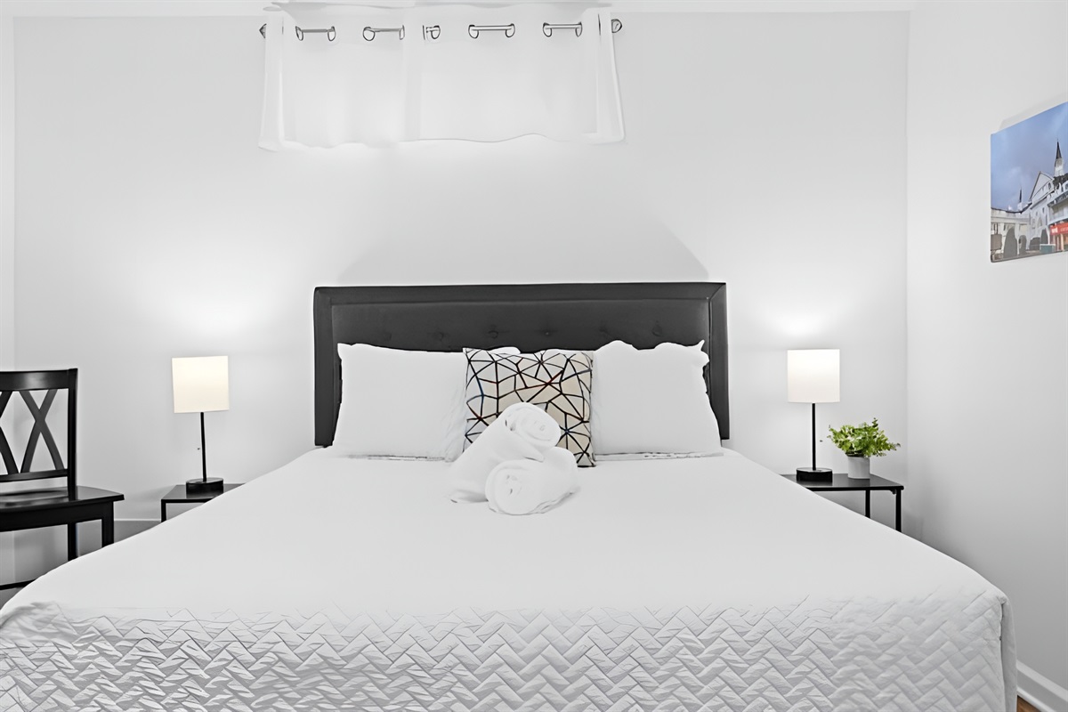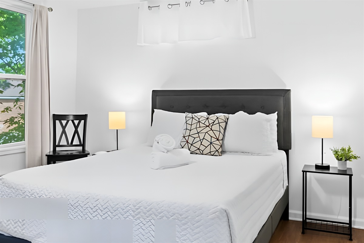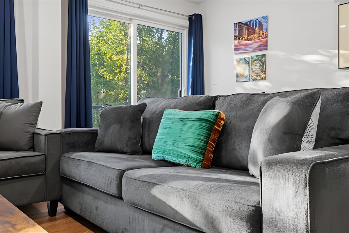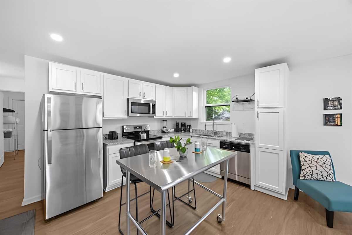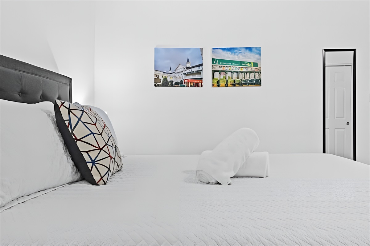Guests can enjoy access to a shared yard, a rare feature in NuLu. Inside, each unit boasts a modern kitchen equipped with stainless steel appliances, complemented by abundant natural light streaming through large glass doors and windows. Perfect for groups visiting Derby, Bourbon & Beyond, or Louder than Life.