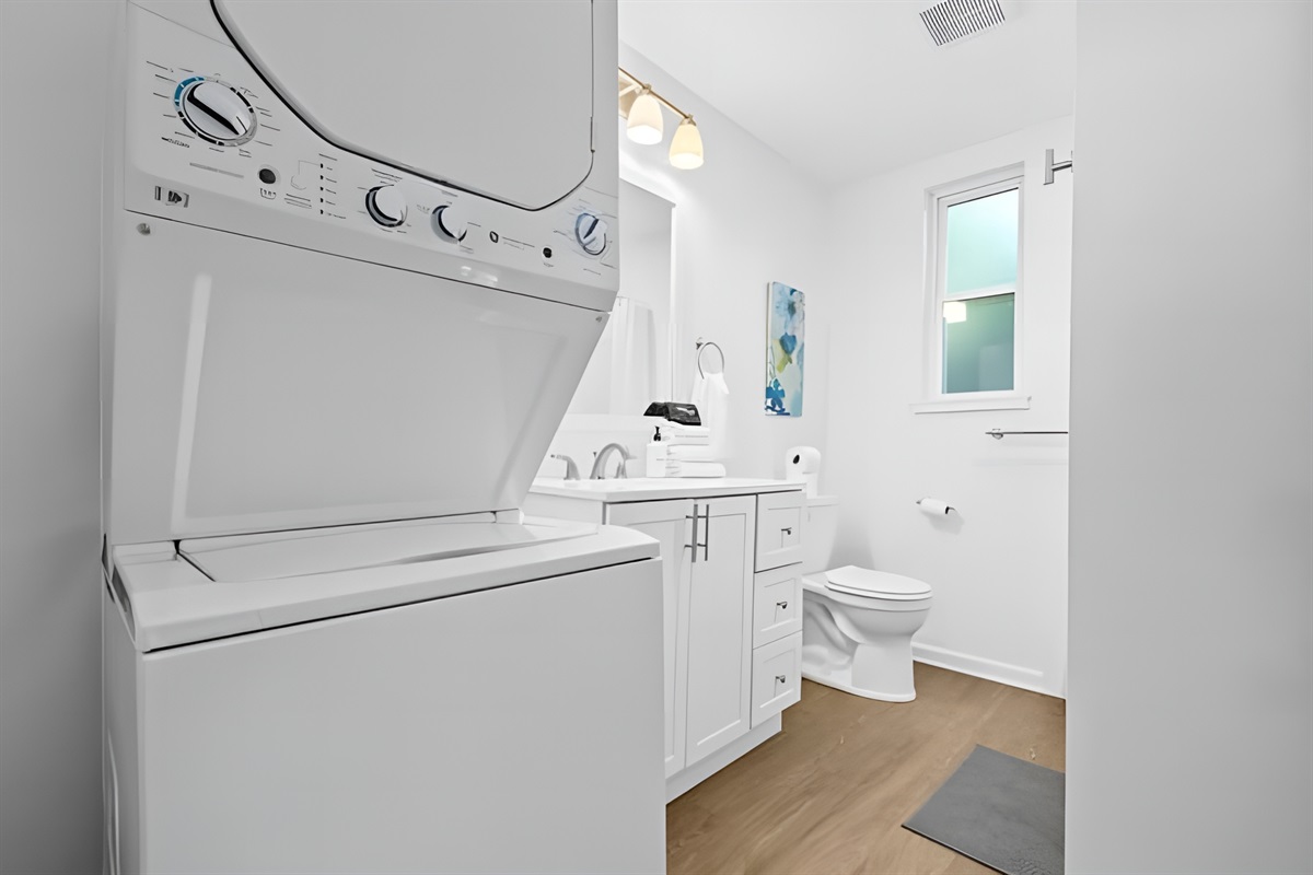 • Bathroom: Full bath with bathtub, sink, toilet, and in unit washer and dryer.