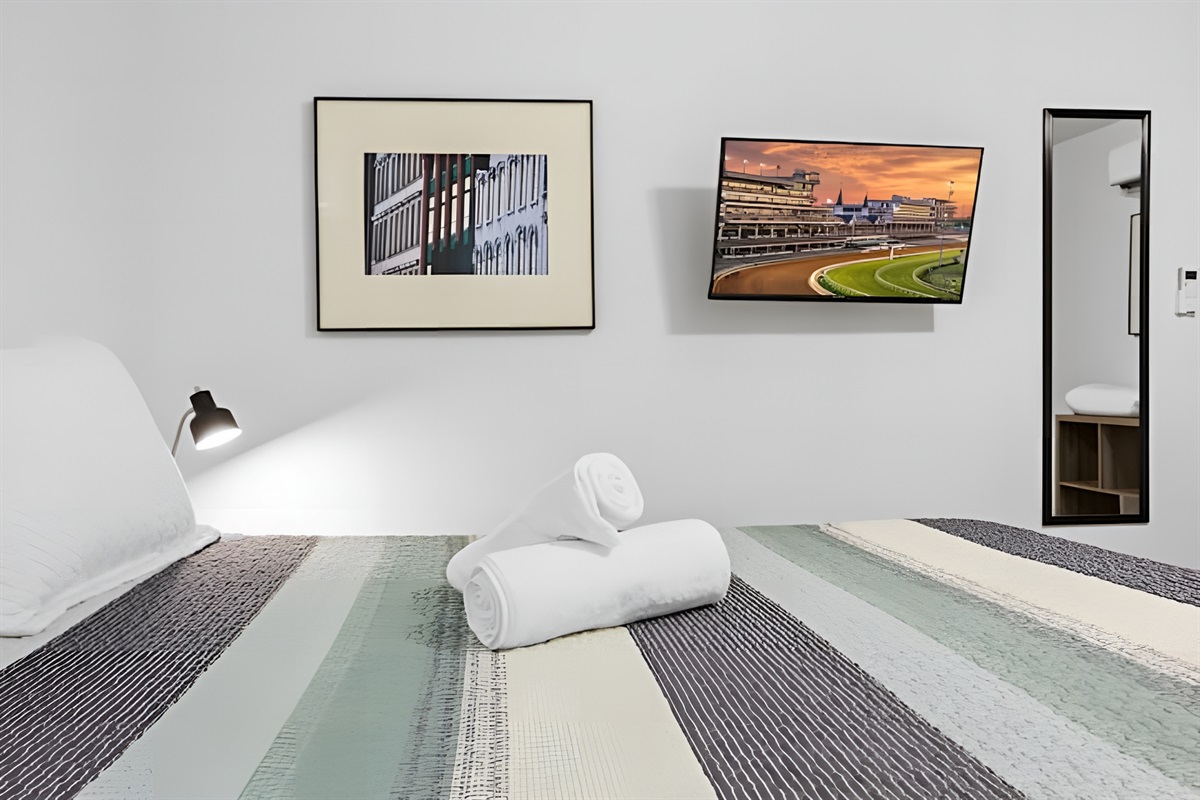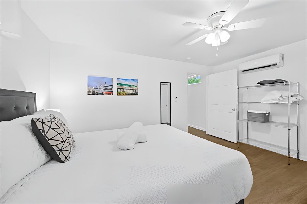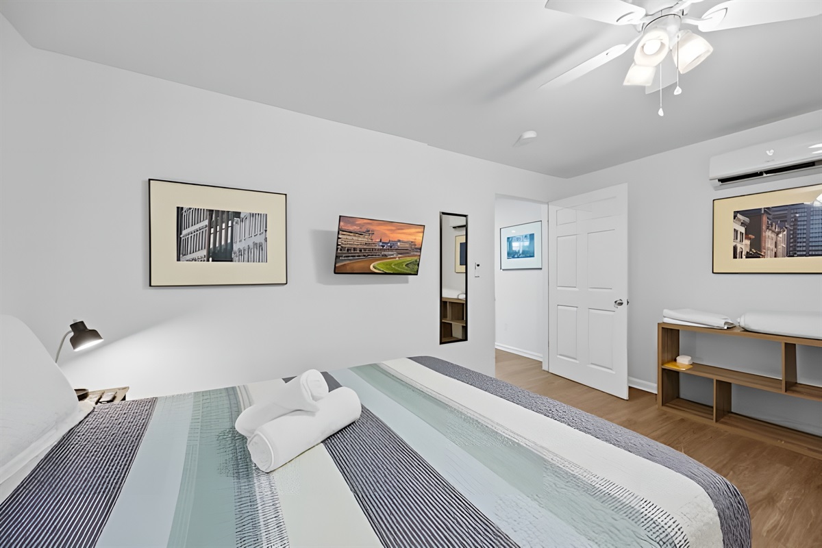 ▻ Bedroom with full body mirror, 1 queen-sized bed, closet w/ iron