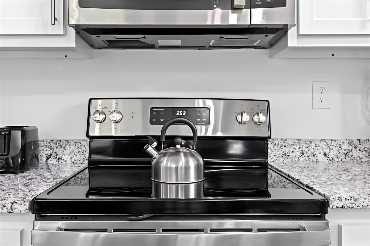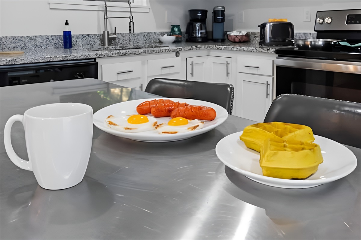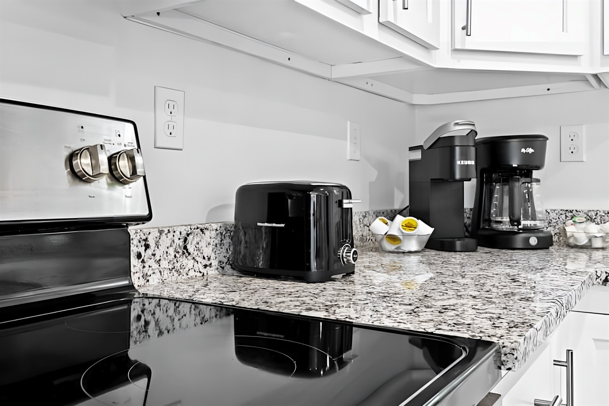 ▻ Kitchen with stove, oven, fridge, microwave oven, basic cookwares, drip coffee machine, Keurig machine, dishwasher