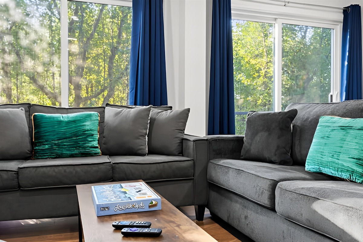 ▻ Living room with a comfortable seating area featuring a sleeper sofa and a daybed chair, equipped with a smart TV (Roku TV) for your relaxation.