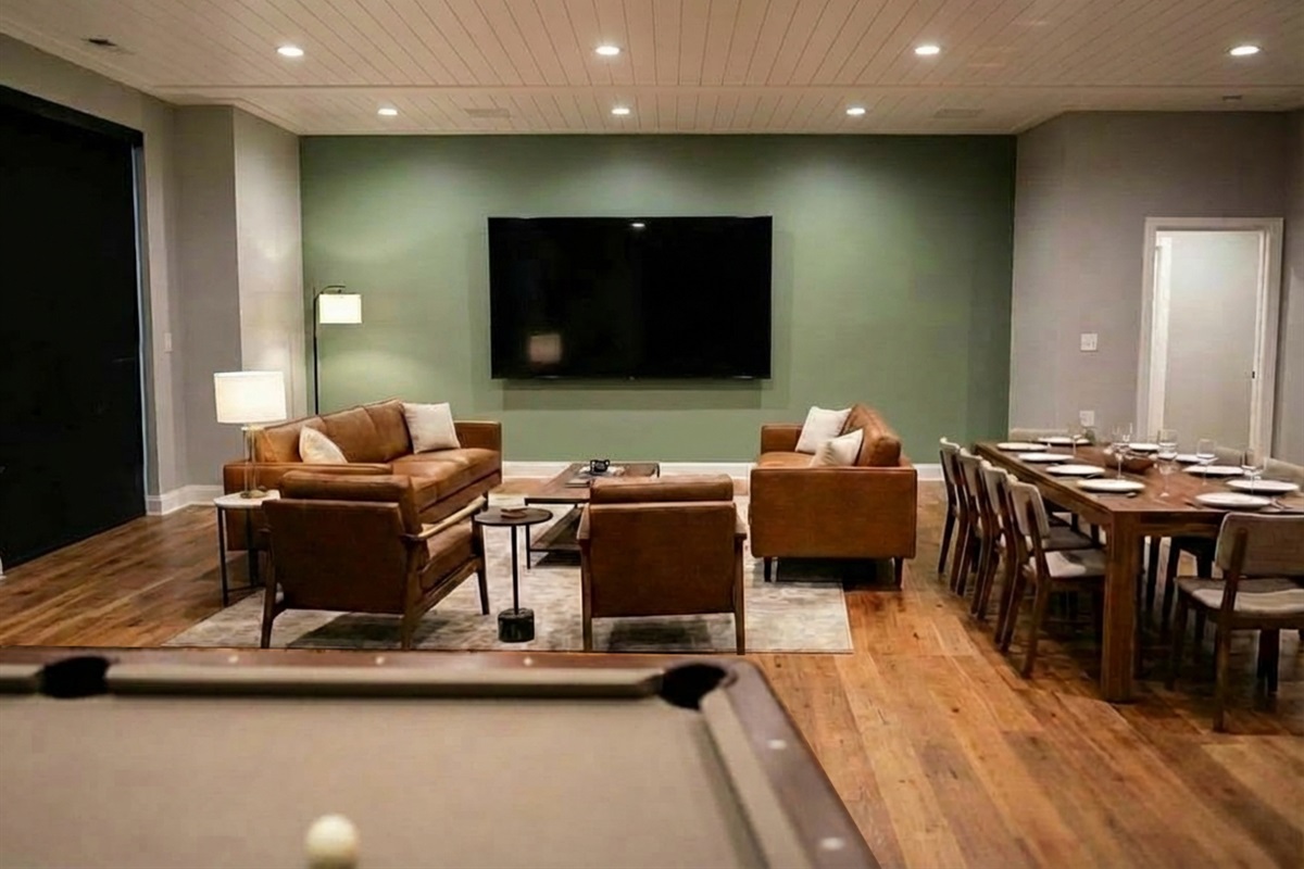 The living room anchors the home with a massive 100-inch television, perfect for movie nights, sporting events, or presentations. A full-size pool table adds a playful social element, making this a natural hub for connection and entertainment.