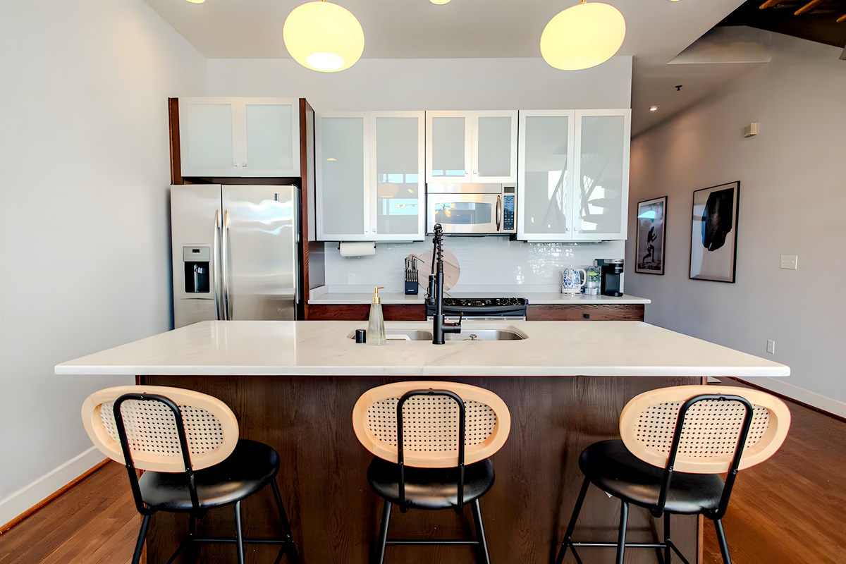 You will have everything you need to relax, including two private outdoor patios, a giant 65 inch TV, and a full kitchen. Whether you are here for fun or work, our special standing desk and fast internet will keep you connected. We also include one covered and gated parking spot just for you!